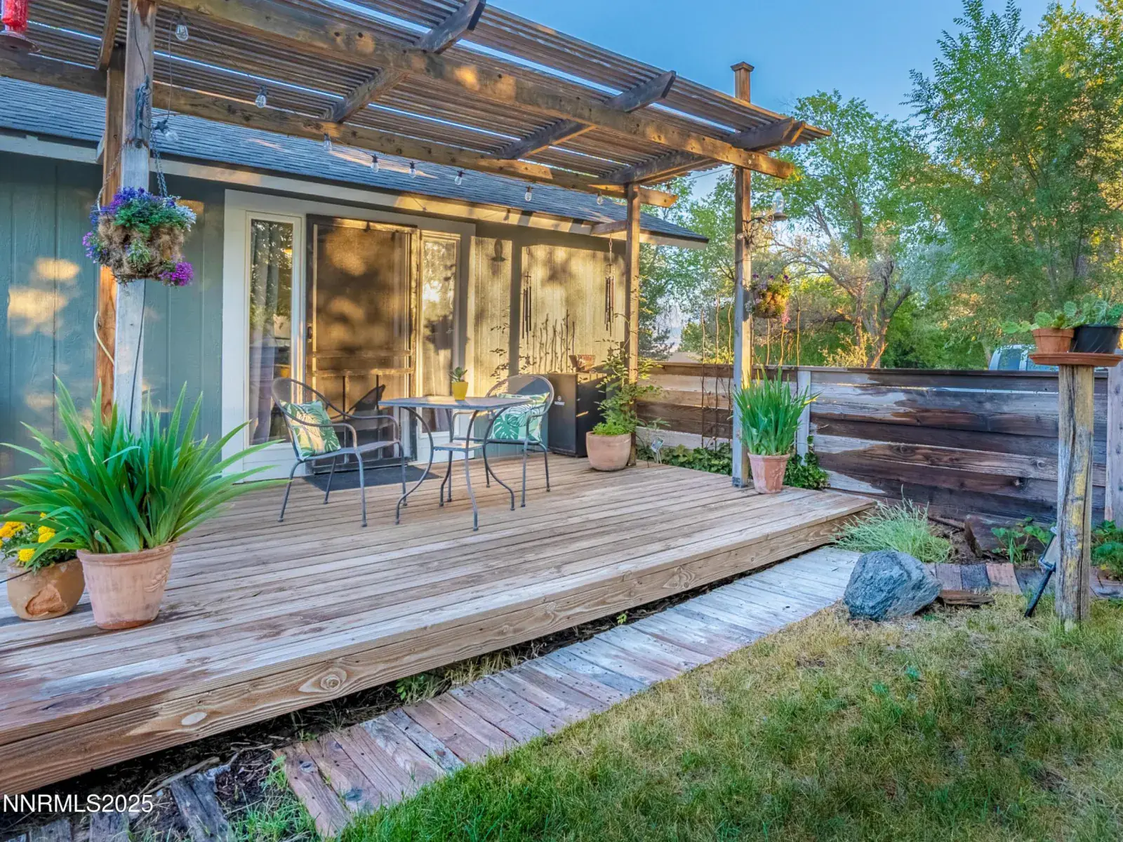 This charming and spacious 1584 sq ft, two-bedroom, two-bath single-family home is nestled on 1.11 acres in the desirable Johnson Lane area, surrounded by mature landscaping offering a peaceful, private- setting. The kitchen is nicely updated with granite counters, brand new appliances, a breakfast bar and plenty of natural lighting. The primary suite opens to a secluded patio with an enchanting wood pergola- perfect for quiet mornings or evening gatherings. A whole-home backup generator adds peace of mind for those occasional outages, and there’s plenty of space for RV parking and all of your recreational vehicles. The property is zoned to allow horses, chickens, and other animals, making it ideal for those seeking a blend of comfort and country living. Conveniently located near shopping, award-winning schools, medical facilities, and just a short drive to Carson City, Reno, and Lake Tahoe