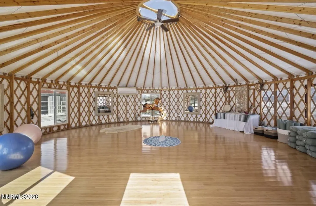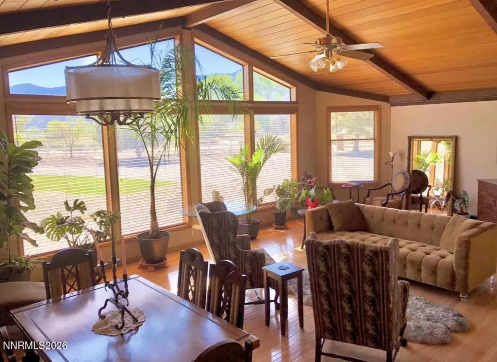 There are properties you purchase, and then there are places you steward, experience, and pass forward. Set on nearly 30 private acres in the heart of Carson Valley, this extraordinary turnkey equestrian compound offers a rare combination of infrastructure, flexibility, and 25.7 acre-feet of highly valuable permitted water rights. Designed as a legacy ranch, luxury retreat, or income-producing equestrian estate, the property includes four separate residences and extensive professional horse facilities. The 3,623 sq ft main home features four bedrooms, three and one-half baths, hardwood floors, a chef’s kitchen with premium appliances, cedar sauna, wet bar, two gas fireplaces, EV-ready garage, and sweeping Sierra and valley views. Additional accommodations include a remodeled chalet, updated bunkhouse with loft, and charming container cottage. Equestrian amenities include a 10-stall barn, tack room, three professional riding arenas, nine loafing sheds, hay barn, grain storage, fenced paddock paradise style pastures, obstacle course, and bamboo-floored yurt studio for yoga, workshops, or retreat gatherings. iPhone operated Irrigated acreage, tree-lined drives, and diverse terrain create a private, versatile compound nearly impossible to replicate today.