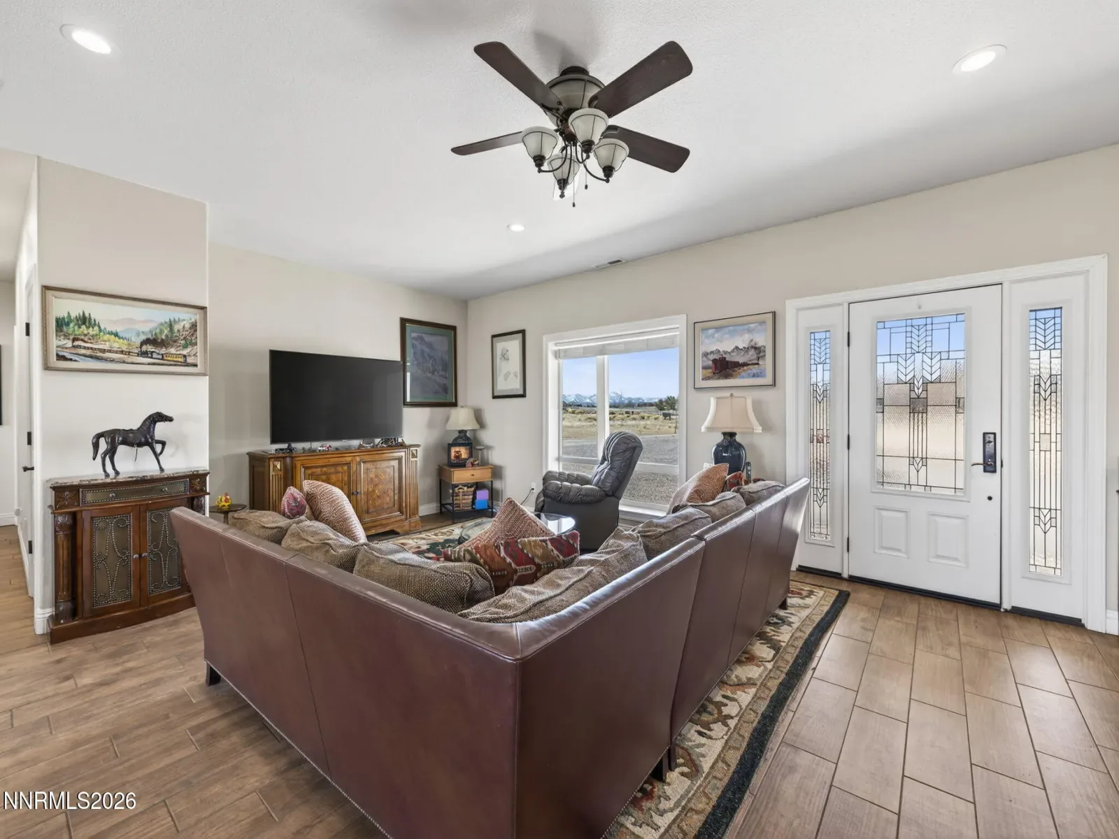 Welcome to this magnificent 3.54-acre view property on the highly desirable east side of the Carson Valley in Minden, zoned for horses and designed for those who want it all. Newly remodeled with top-tier upgrades and completely move-in ready, this exceptional home offers 3,293 square feet of refined living with breathtaking 360-degree mountain views from every window and door. The spacious, open/split floor plan places all primary living areas on the main level, featuring living room, kitchen, dining room, three spacious bedrooms, three full bathrooms, large laundry room and an oversized three-car garage. An expansive upstairs bonus room provides ideal flexibility for a media room, office, gym, or guest retreat. Natural light and new LED fixtures throughout, fills the home, enhancing the seamless flow and stunning surroundings. Recent upgrades include a brand-new 50-year roof and gutters, new HVAC system with furnace and ducting, well pump and plumbing, tankless water heater, kitchen appliances, water softener, toilets, bathroom windows, and instant filtered hot and cold water at the kitchen sinkāoffering comfort and long-term peace of mind. The luxurious primary suite is a true sanctuary with generous space, separate walk-in closets, and captivating Sierra mountain views. Guest bedrooms also feature large walk-in closets. Outside, covered front and rear patios create the perfect setting for entertaining or relaxing with views, in the fresh valley air. The flat, usable acreage includes an existing horse setup and ample space for RV parking, equipment, toys, and endless possibilities to create your ideal Nevada lifestyle.