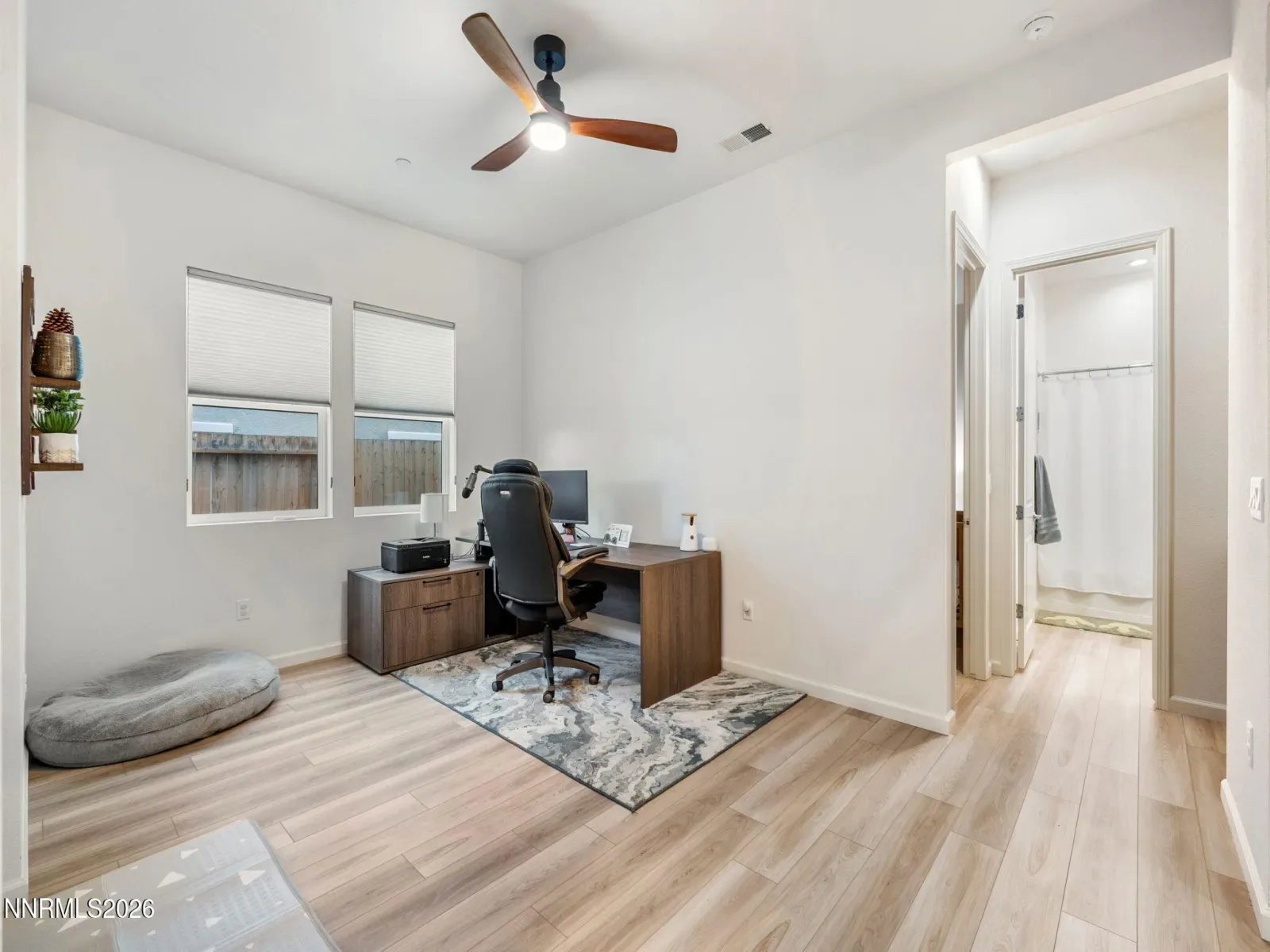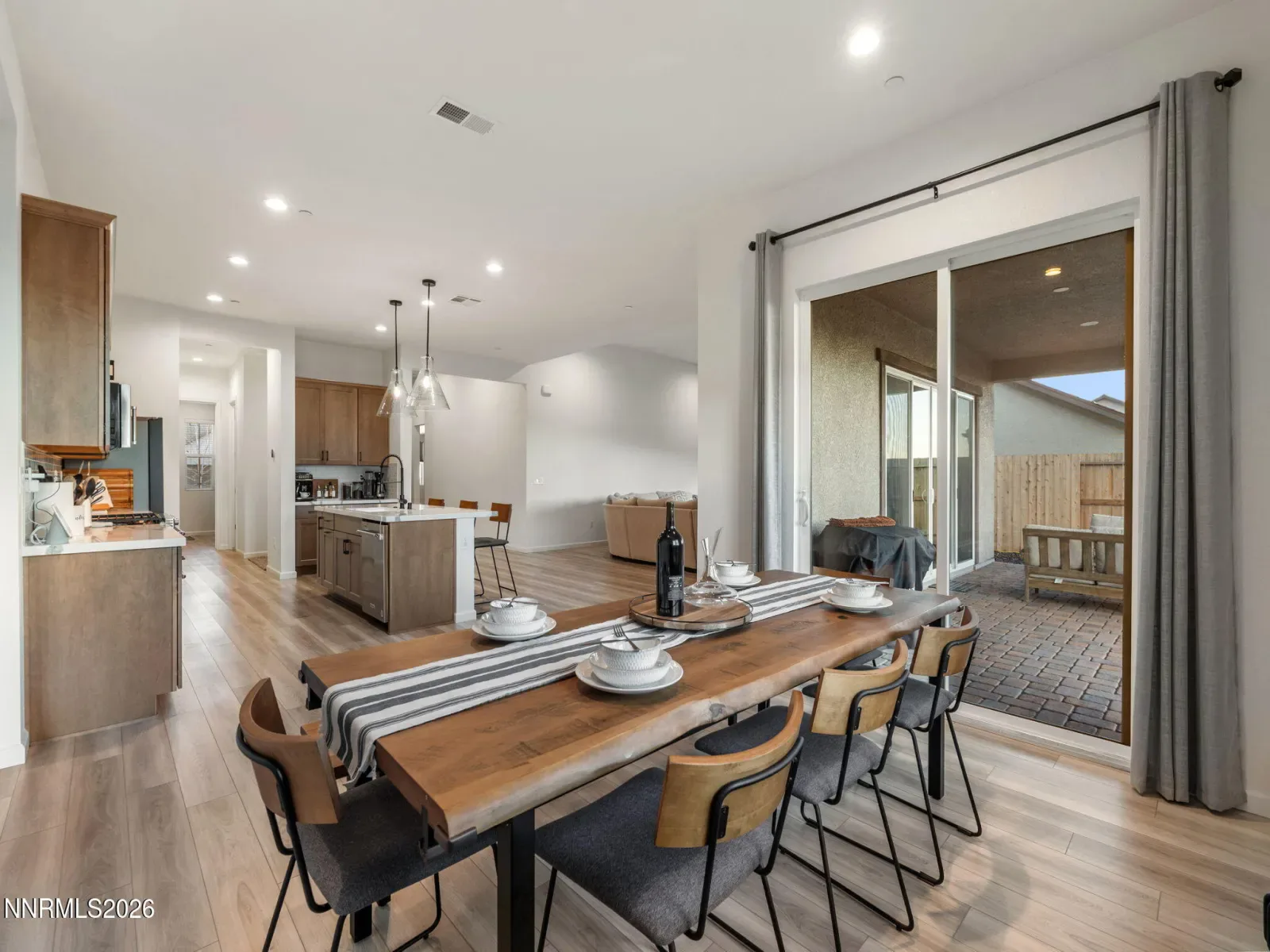 Beautifully upgraded single-story home located in the highly sought-after Cinnamon Ridge community in Spanish Springs. Thoughtfully designed and impeccably maintained, this residence offers 3 full bedrooms, 3 full bathrooms, and a dedicated officeāproviding ideal flexibility for a home office, creative space, or quiet retreat. Inside, soaring 10- and 12-foot ceilings, designer accent walls, and updated lighting create a warm and sophisticated atmosphere throughout the home. The open layout allows the great room, kitchen, and outdoor living spaces to connect seamlessly, making the home equally suited for everyday living and entertaining. Expansive windows fill the home with natural light, while durable luxury vinyl plank flooring runs throughout the main living areas for a clean, modern aesthetic. The kitchen combines style and functionality with upgraded lighting, a huge walk-in pantry, and convenient access to the covered loggiaāperfect for extending gatherings outdoors. The spacious great room enjoys beautiful backyard views, with a sliding glass door creating an easy transition to the outdoor living space. The primary suite offers a peaceful retreat, highlighted by a spa-inspired bathroom featuring a freestanding soaking tub and thoughtfully selected finishes. Outdoor living is equally impressive. The backyard enjoys exceptional privacy with no rear neighbors now or ever, as the land directly behind the property is protected Indian reservation land. An extended paver patio and covered loggia provide an inviting setting for outdoor dining and entertaining, while a gas stub is already in place for a future built-in BBQ or fire feature. Additional upgrades include ceiling fans in every room, a tankless water heater, and wiring in place should a future owner wish to activate a monitored security system. The spacious 4-car garage includes 220 power for EV charging, and the property also offers the possibility for a future buyer to add RV access if desired. With its thoughtful upgrades, private backyard setting, and prime location within Cinnamon Ridge, this home offers a rare opportunity to enjoy comfortable, modern single-story living.