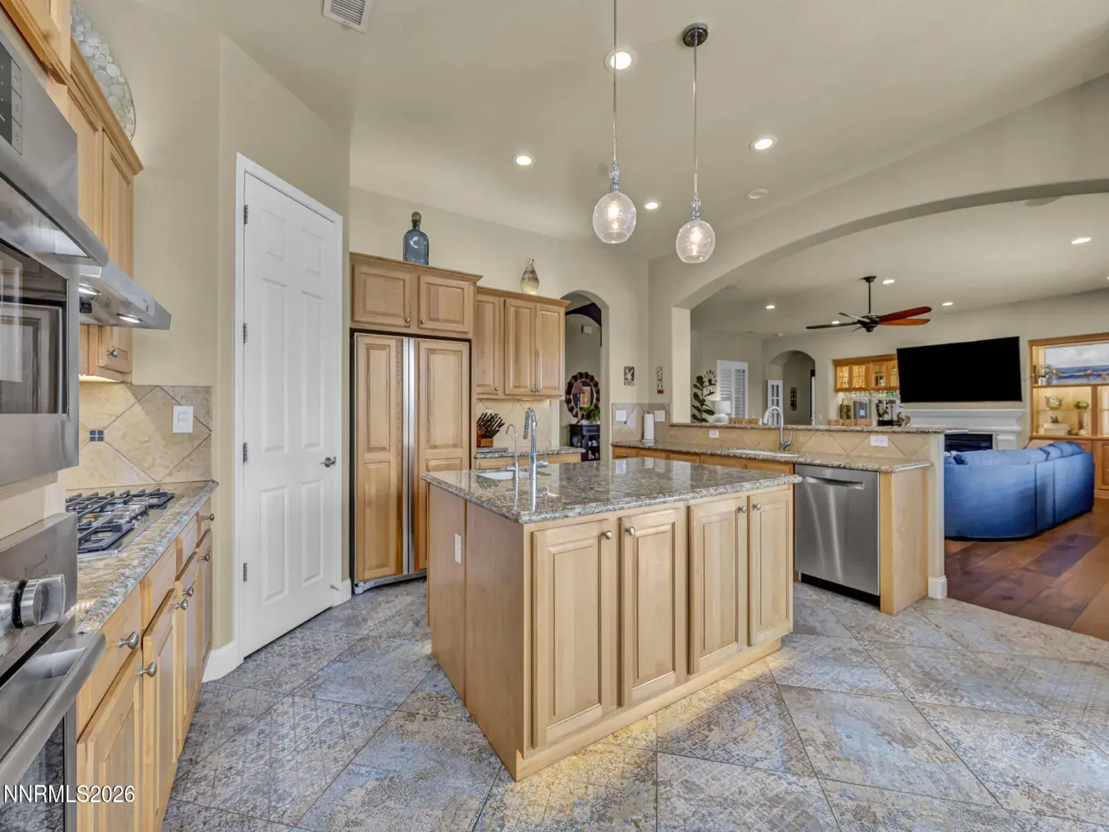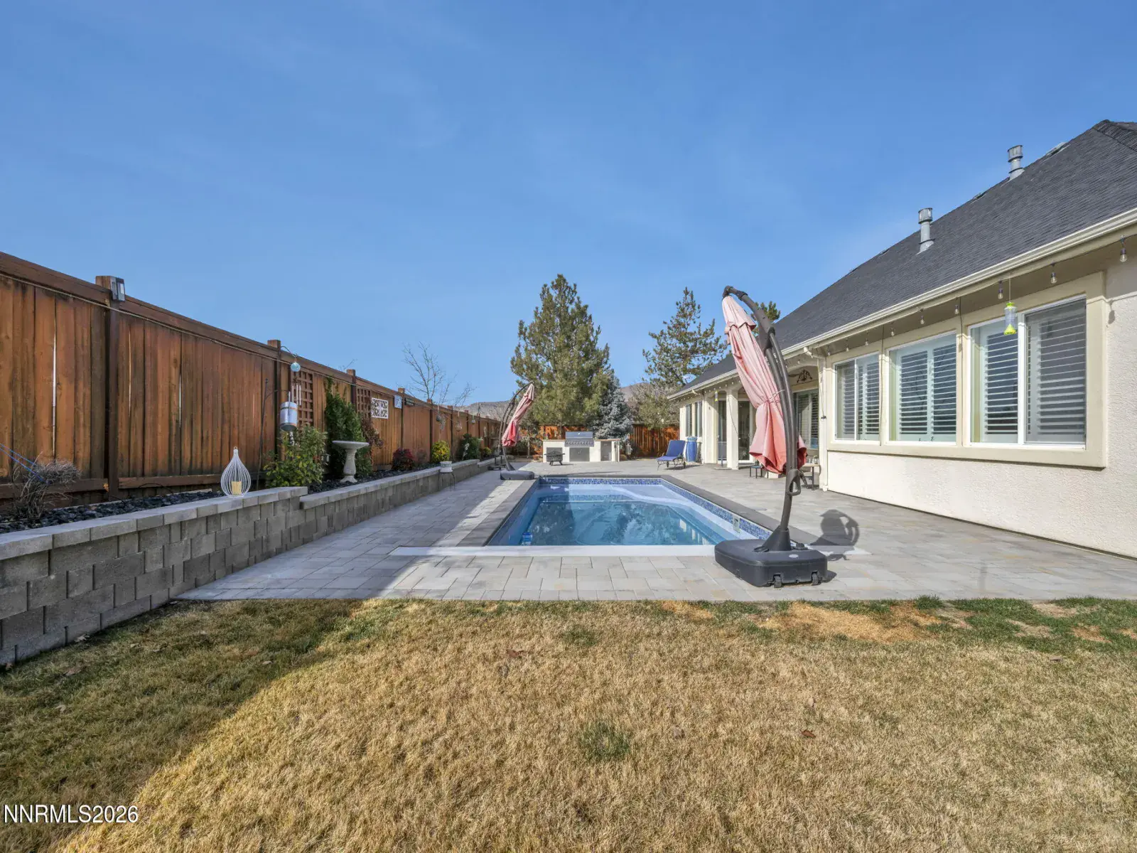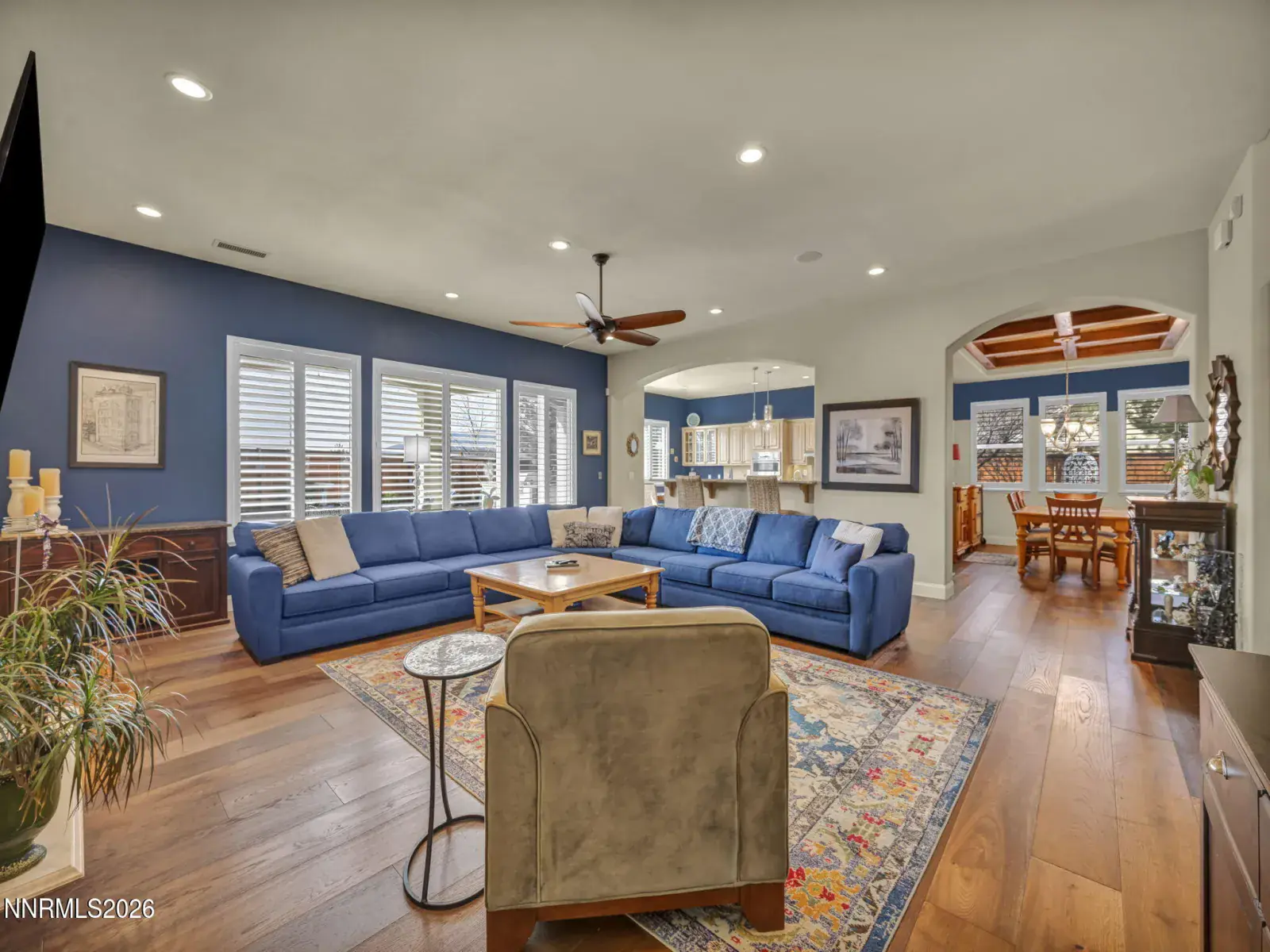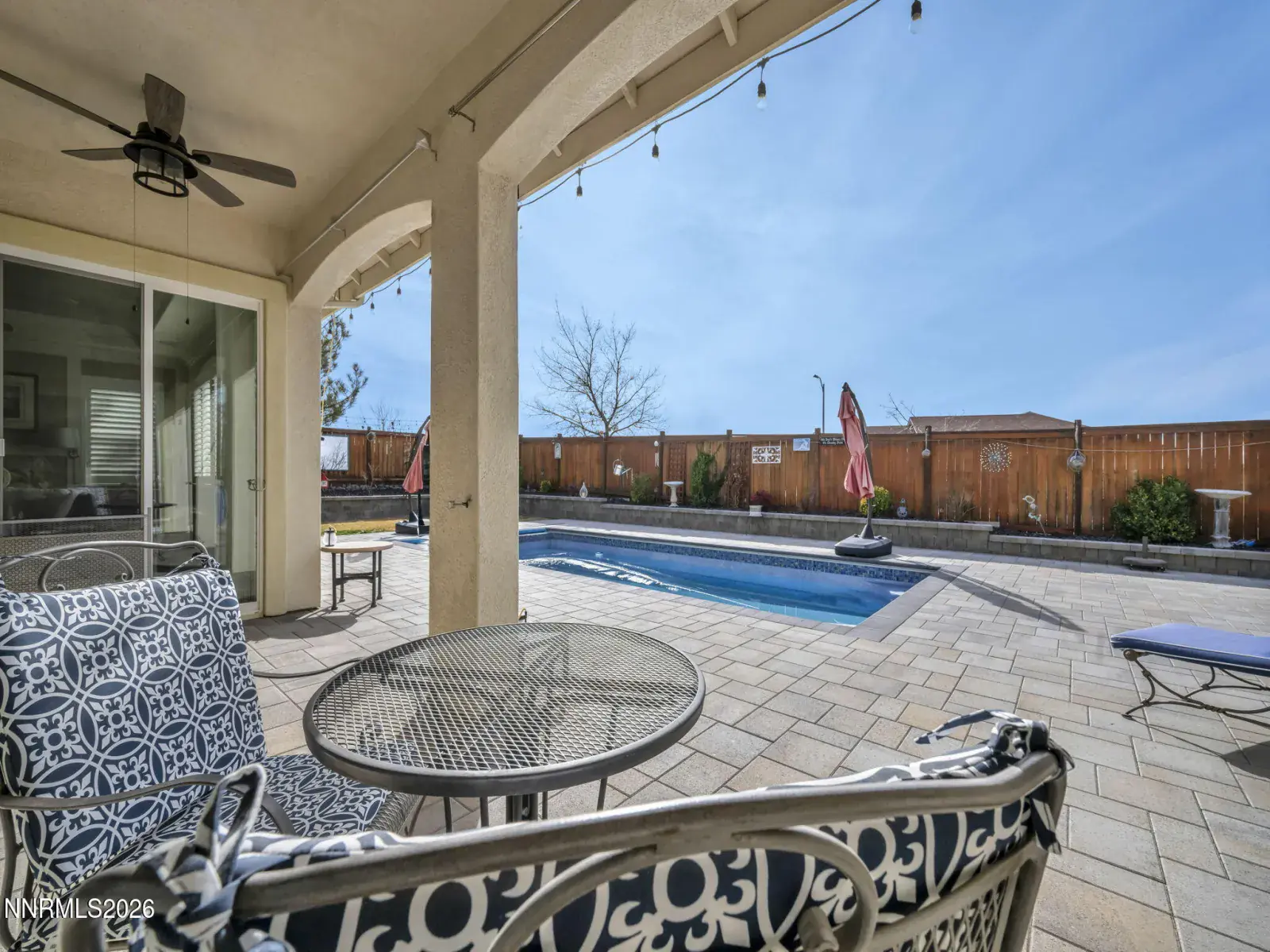 Welcome to one of the most upgraded and impressive homes in Spanish Springs’ sought-after Shadow Ridge community. This priced to sell former model home offers 3,018 sq ft of thoughtfully designed space with 4 bedrooms, 3 bathrooms, and a 3-car garage. From coffered ceilings and luxury vinyl plank flooring to custom shutters and THREE gas fireplaces, every detail reflects quality and comfort. The chef’s kitchen features a gas cooktop, two sinks, generous counter space, and seamless flow for entertaining. Built-in surround sound enhances the living experience throughout the home. Step outside to your private backyard oasis with no rear neighbors, an in-ground pool, custom paver patio, covered patio with fans, RV parking, and added storage. Gutters surround the home and the upgrades are already done. This home truly sets the standard in Shadow Ridge.