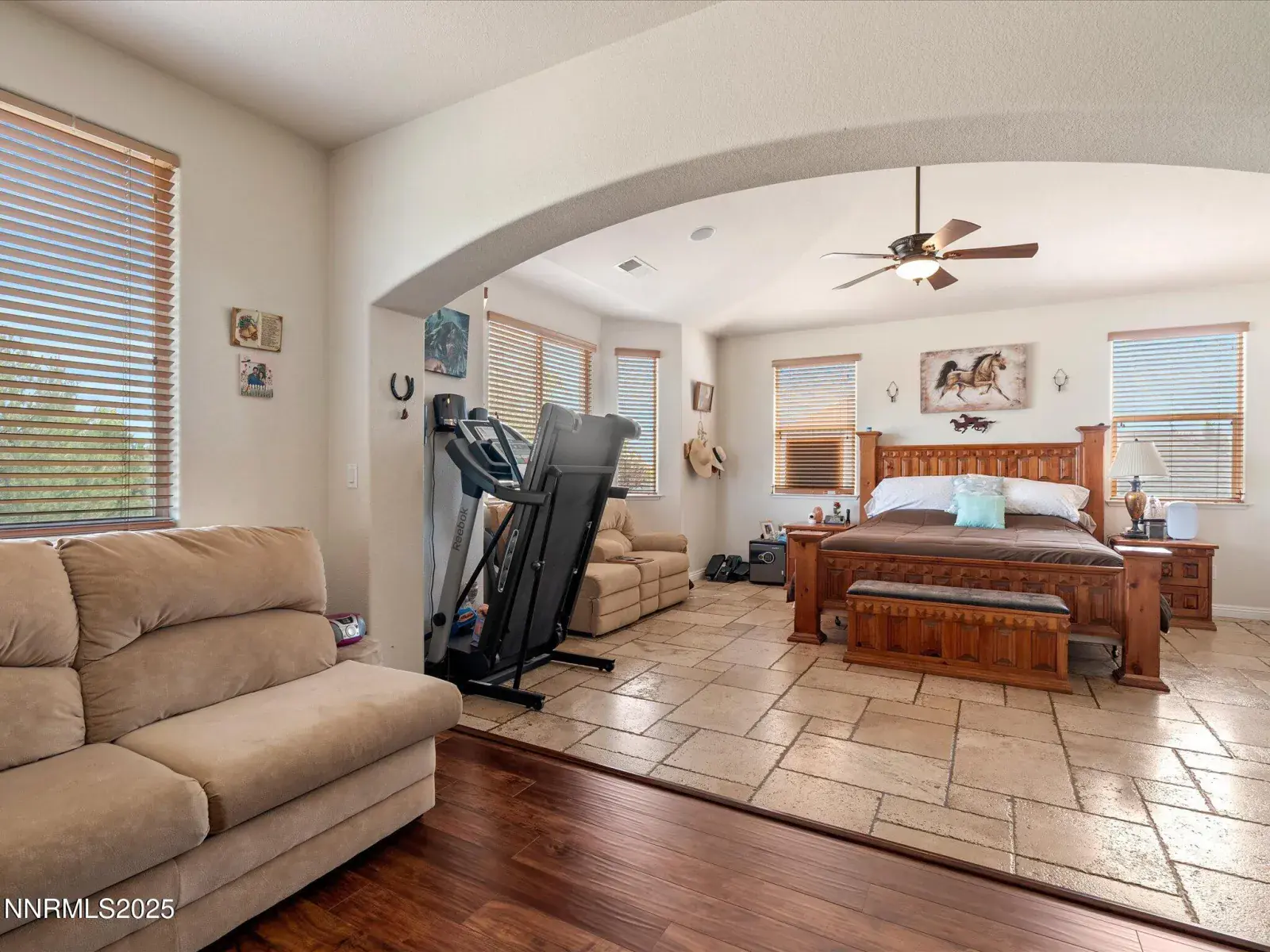 Inside, the home features travertine tile and laminate flooring throughout. The open kitchen is highlighted by granite countertops and backsplash, extended cabinetry, and a convenient wet bar with wine fridge. A full bedroom and bathroom on the main level provide flexibility for guests or multigenerational living. Upstairs, you’ll find four additional bedrooms plus a loft with a built-in desk and office cabinetry. The primary suite is truly special, with a large attached bonus room- perfect for an office, fitness space, or custom walk-in closet- and a spa-like bathroom with a deep jetted tub.