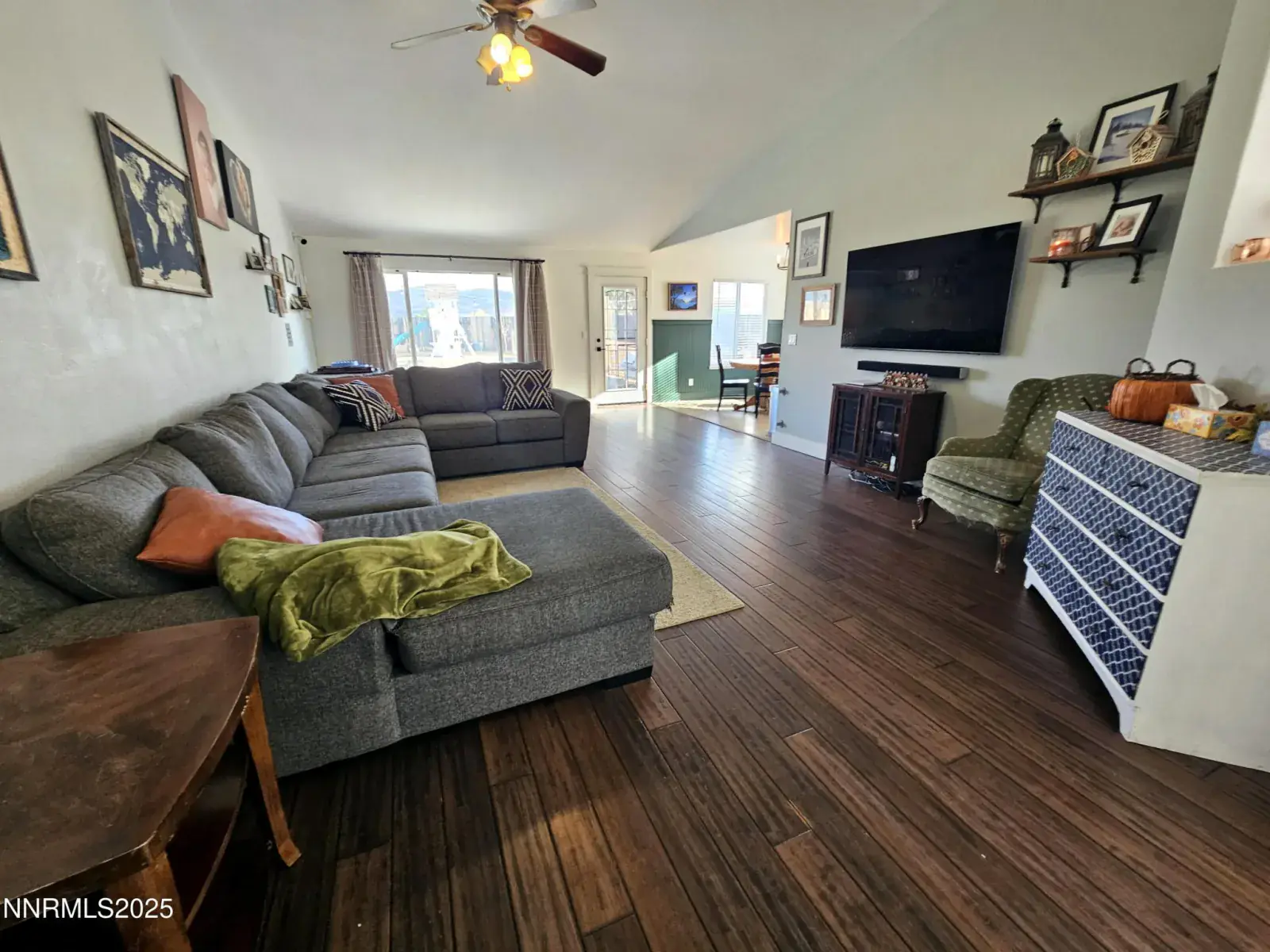Looking for a large Spanish Springs home with an even larger lot? This beautiful home has 5 big bedrooms, 3 full bathrooms, one of the largest lots in the neighborhood and tons of room for RV parking and even a future shop or outbuilding! Vaulted ceilings in the living and family rooms with lots of natural light. Bamboo laminate flooring throughout most of the home. The kitchen offers lots of cabinet space, granite counters and stainless-steel appliances. The refrigerator is included, too! There is a huge pantry in the hallway as well as lots of linen storage. All the baseboards and door casings in the home have been replaced with craftsman-style finishes. All new lighting and door hardware have been added throughout the home. The primary bedroom a decorative wooden feature wall, French-doors to the hall, sliding glass door to the patio, ceiling fan and 2 closets! The primary bathroom is large with a soaker tub, walk-in shower and double sinks. 2″ wood blinds in living room, family room and front bedroom. Ceiling fans in both the family room and living room. The huge laundry room has cabinets, counterspace, and lots of room to work. 2 of the bedrooms have decorative wall paneling, as well as the dining nook! Decorative steel security doors on front and back of home. The lot is very low-maintenance and there are 2 sets of RV gates! Huge cement and paver patio areas with a fire pit, and no-maintenance artificial turf. There is a large area fenced off for a dog-run, and there are posts installed to string lights over the patio. Full rain gutters around the house. The garage has a pull-down ladder and electric openers for both roll-up doors. The furnace has been replaced with a high-efficiency model. The water heater has been replaced and has a water-circulation pump, so you’ll have hot water quickly for your showers! The driveway is large enough for many vehicles, and there is so much room for toys here. If you need a large home, a large garage and a large lot, this may be the home for you!