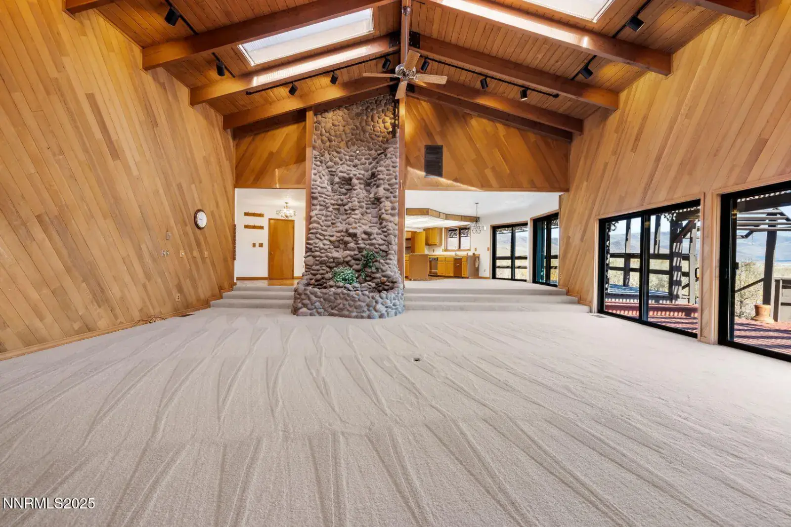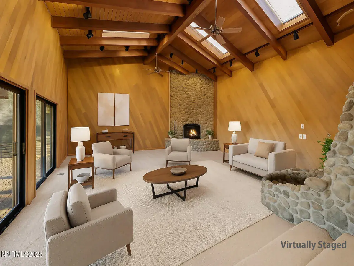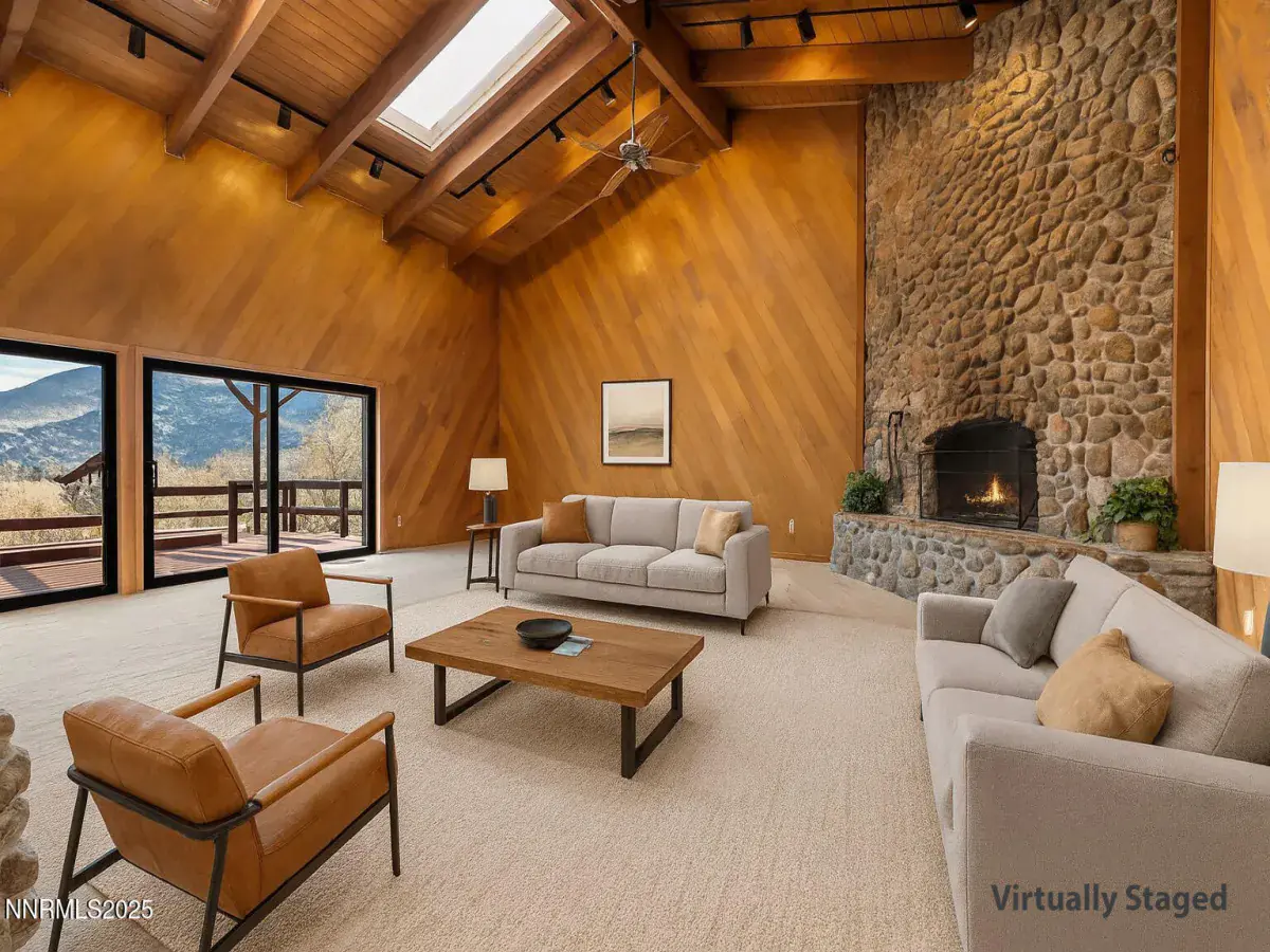 Welcome to this beautifully refreshed McCarran Ranch Estate, set on a private, gated 6-acre horse property overlooking the majestic Truckee River. Modern improvements include new interior and exterior paint, new water heater, brand-new 500 gallon propane tank, top-of-the-line windows and sliders, and new central air, delivering contemporary comfort in a setting rich with Nevada heritage. Inside, a floor-to-ceiling river rock fireplace anchors a massive living room with 20-foot vaulted ceilings, while a dramatic river rock water feature adds natural beauty and serene ambiance. Light pours through the new windows, framing views of the surrounding ranch landscape. Outdoor living is equally impressive, featuring a terraced backyard with a gazebo, ideal for relaxing, entertaining, or simply taking in the panoramic scenery. For the hobbyist, collector, or outdoor enthusiast, the property boasts two garages with parking for up to 11 vehicles. Enjoy privacy, wide-open space, and commanding views all within minutes of town — just 5 minutes to USA Parkway and 15 minutes to Sparks. This rare offering combines modern upgrades, exceptional setting, and the legacy of Historic McCarran Ranch into one remarkable estate experience. Also includes a backup generator with a 2,500-gallon tank. This one-of-a-kind estate features a large unfinished daylight basement with a bathroom and a new slider, offering tremendous potential for additional living space, guest quarters, or hobby rooms.