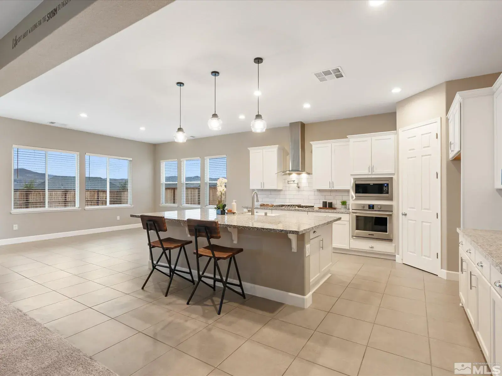 The showstopping chef’s kitchen offers granite countertops, Frigidaire appliances, soft-close cabinetry, a massive island with farm sink, 5-burner gas range, and a convenient pot filler faucet. The living room features large windows with mountain views, a cozy gas fireplace, and prewiring for surround sound.