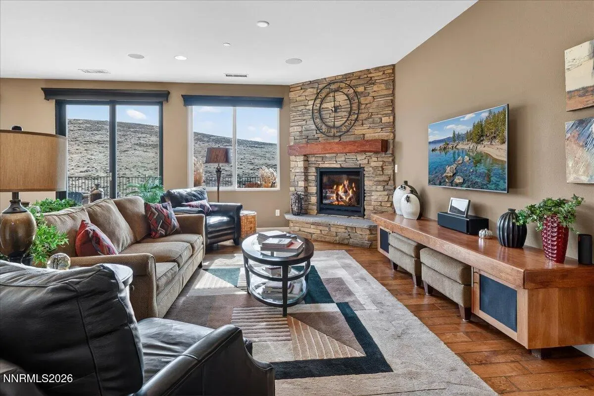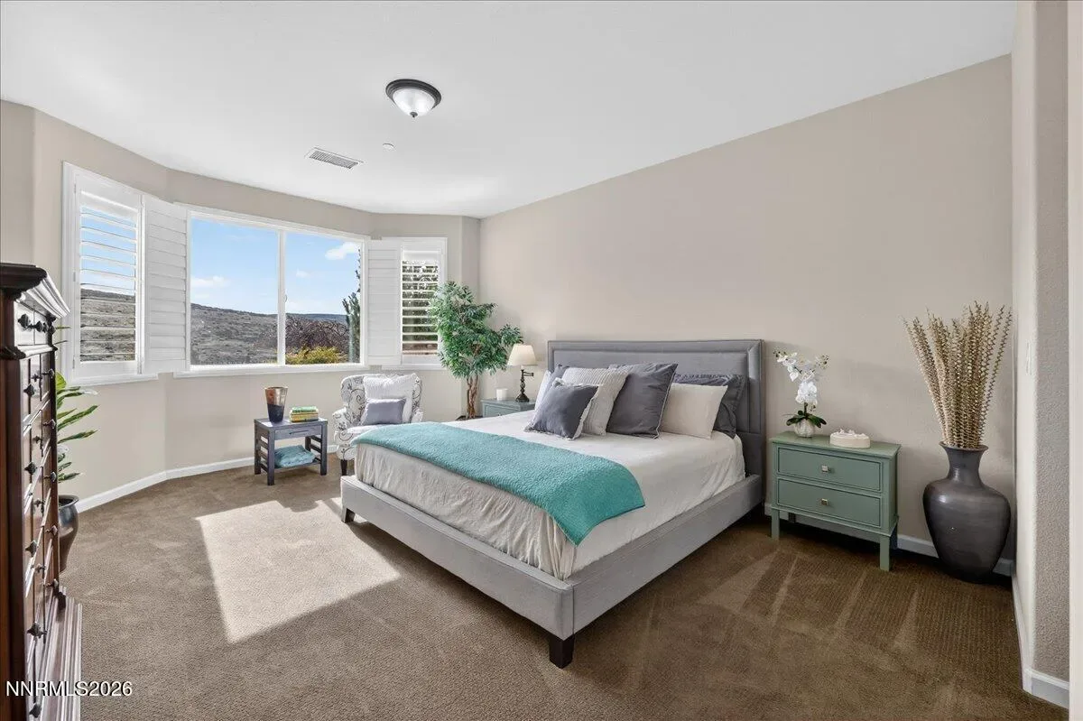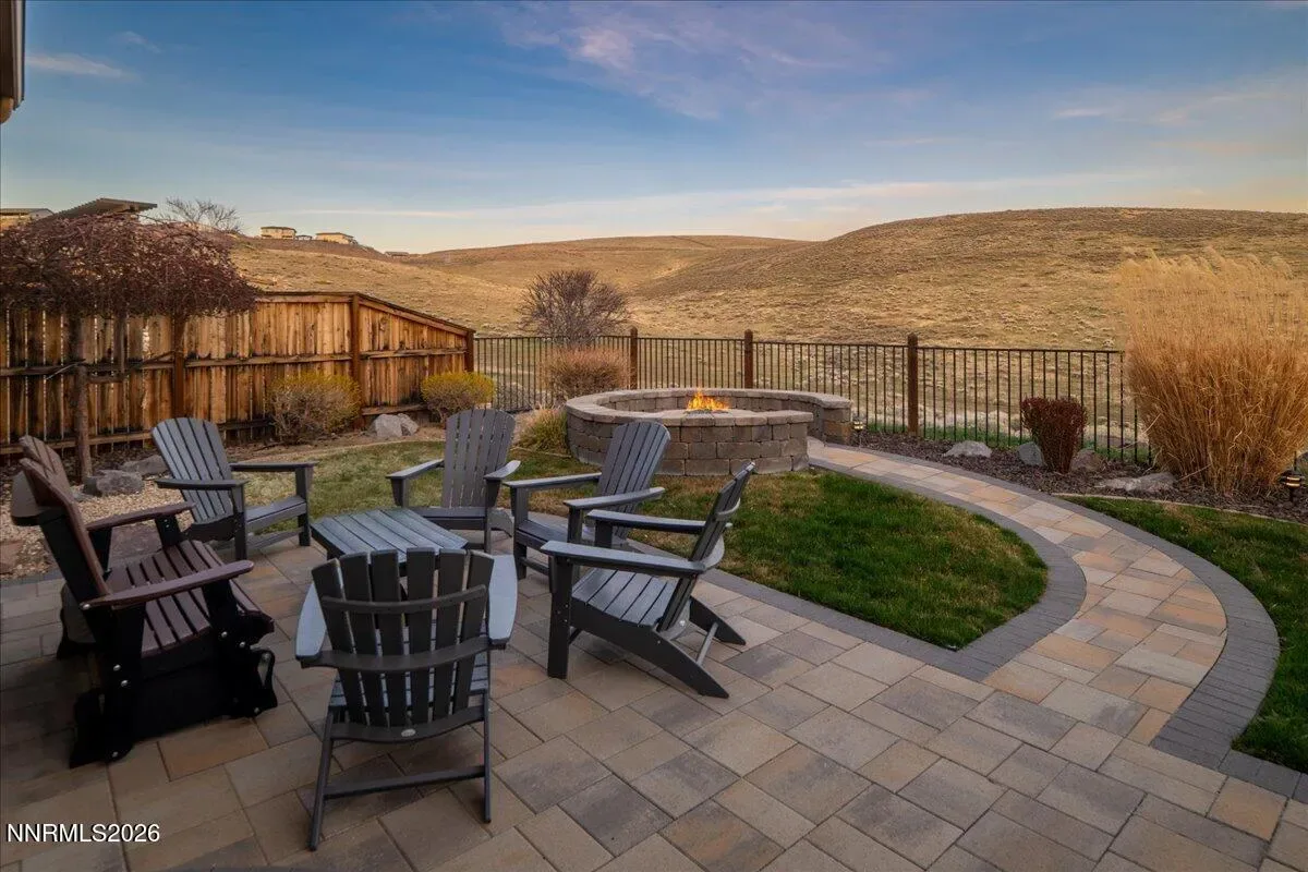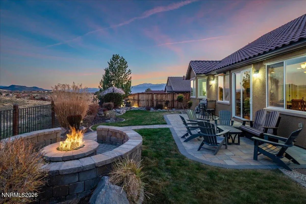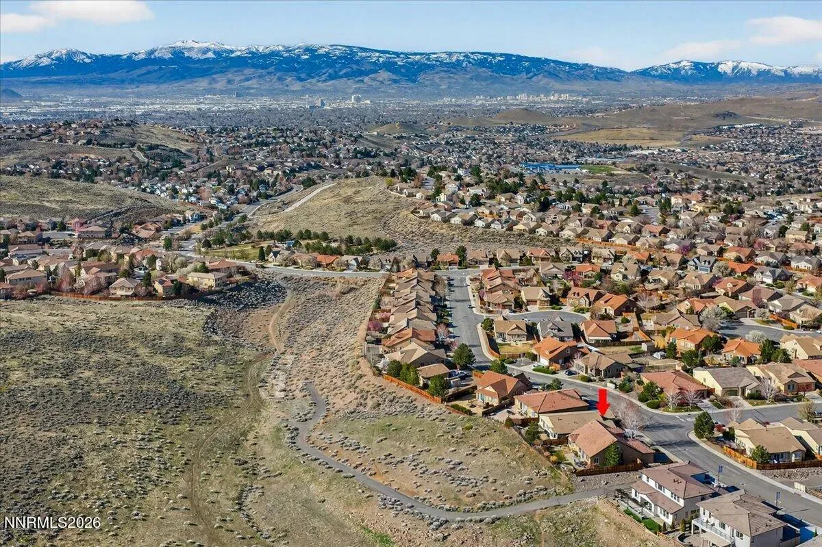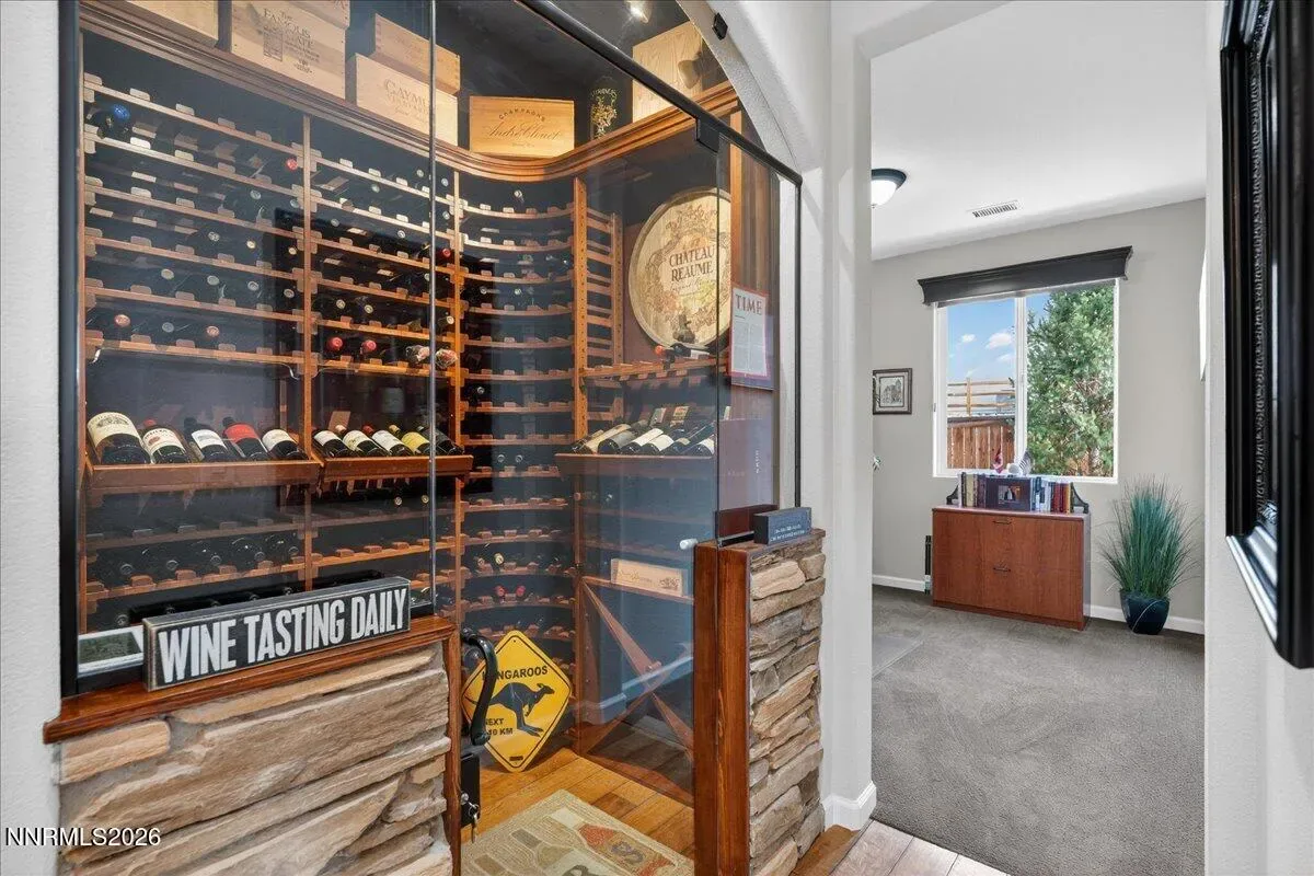 Views of Mt Rose, Slide Mtn and serene rolling hills all from a very private backyard. This quaint home is a rare find nestled in the Vistas. You’ll find this quality built, highly upgraded home located in the community of Miramonte. Just one of the many custom features within this home is a large custom built, temperature-controlled wine cellar. From the moment you enter, you’ll see that this beautiful, well-maintained home is immaculate and exudes true pride of ownership. The kitchen offers ample space for entertainment around the circular custom island. Or you have the option to gather in the great room near the stunning floor to ceiling stone fireplace with a large Heat & Glo gas insert. The oversized primary bedroom plus an office/den are both located conveniently on the main floor. The primary bathroom includes a sizable walk-in shower with a bench seat, dual vanities and a deep jetted bathtub. The attached media console in the great room was custom built and will stay with the home. Large windows span across the back of the home show casing the extraordinarily private backyard where you can step out to enjoy the unobstructed Views of Mt Rose, Slide Mtn, and the serene colors of the desert with rolling hills, filled with all types of beautiful nature. Sit by the open firepit or walk across the extended paver patio to lounge by the flowing water feature. The Seller had an outdoor heater installed for enjoyment on chilly evenings. The laundry room is located conveniently right next to the garage which is finished with insulated walls, insulated garage door, paint, texture and baseboard.
