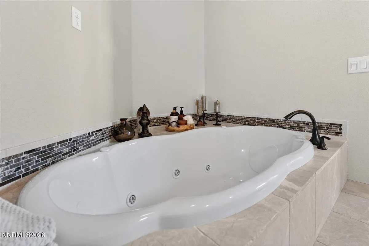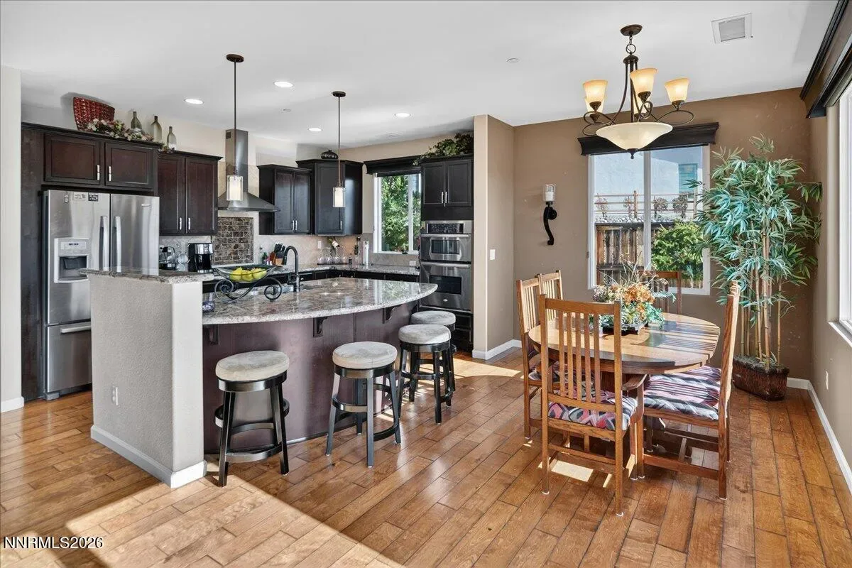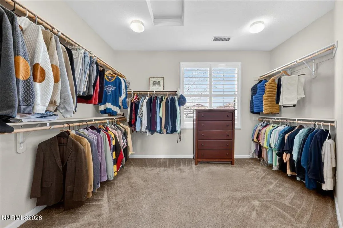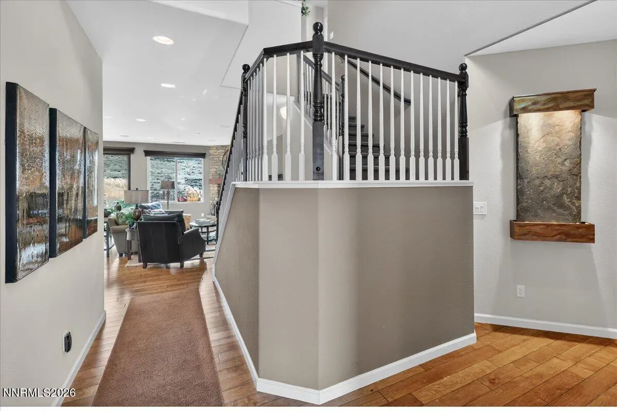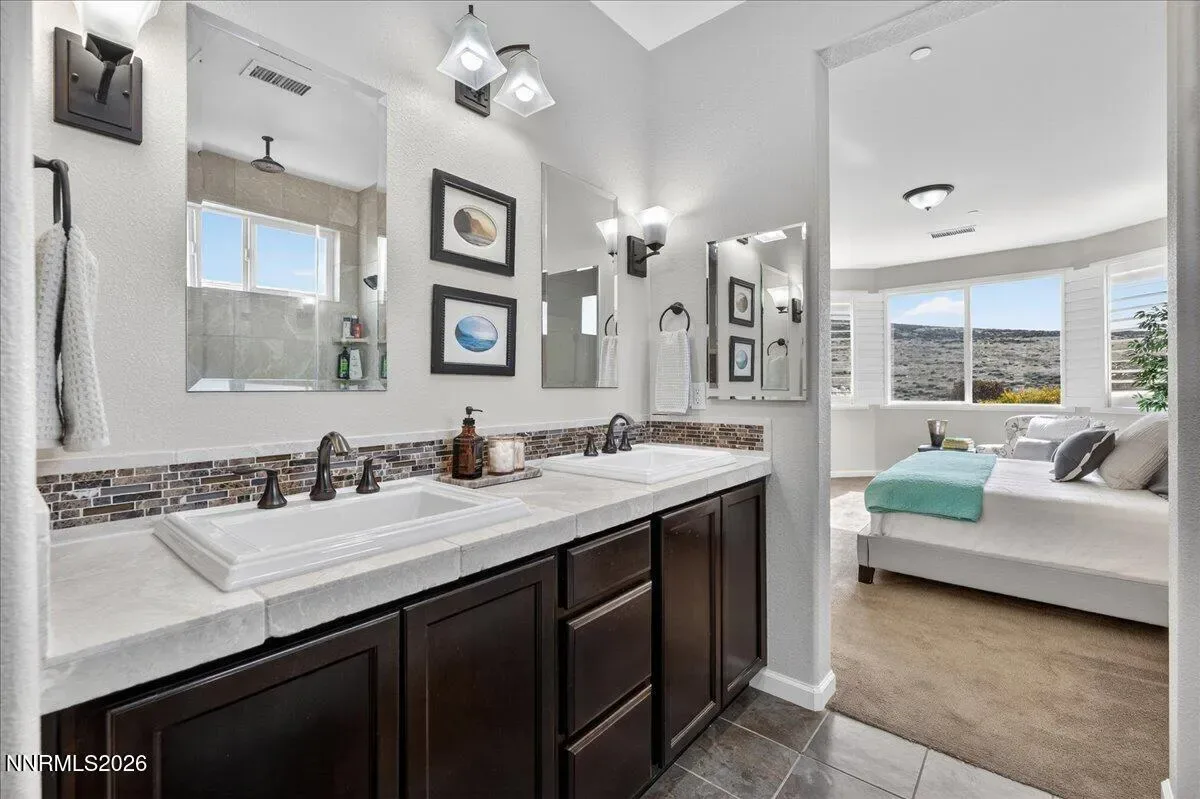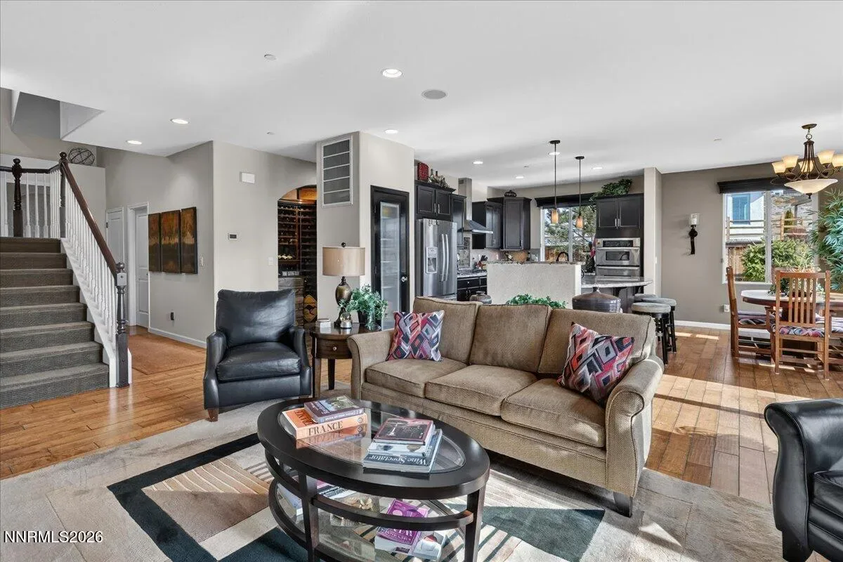 Views of Mt Rose, Slide Mtn and serene rolling hills all from a very private backyard. This quaint home is a rare find nestled in the Vistas. You’ll find this quality built, highly upgraded home located in the community of Miramonte. Just one of the many custom features within this home is a large custom built, temperature-controlled wine cellar. From the moment you enter, you’ll see that this beautiful, well-maintained home is immaculate and exudes true pride of ownership. The kitchen offers ample space for entertainment around the circular custom island. Or you have the option to gather in the great room near the stunning floor to ceiling stone fireplace with a large Heat & Glo gas insert. The oversized primary bedroom plus an office/den are both located conveniently on the main floor. The primary bathroom includes a sizable walk-in shower with a bench seat, dual vanities and a deep jetted bathtub. The attached media console in the great room was custom built and will stay with the home. Large windows span across the back of the home show casing the extraordinarily private backyard where you can step out to enjoy the unobstructed Views of Mt Rose, Slide Mtn, and the serene colors of the desert with rolling hills, filled with all types of beautiful nature. Sit by the open firepit or walk across the extended paver patio to lounge by the flowing water feature. The Seller had an outdoor heater installed for enjoyment on chilly evenings. The laundry room is located conveniently right next to the garage which is finished with insulated walls, insulated garage door, paint, texture and baseboard.