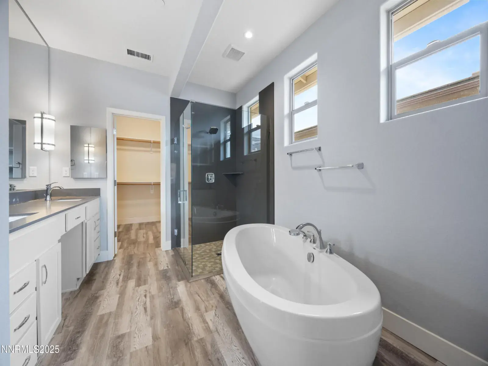 Elegant Single-Story Living in Sparks! This beautifully designed home features 4 spacious bedrooms, 3 stylish bathrooms, and a 2-car garage, all on one convenient level. A versatile den/office offers the perfect work-from-home space without giving up a bedroom. Natural light floods the open living and entertaining areas through expansive windows. The upgraded kitchen boasts stainless steel appliances, and the separate laundry room comes complete with washer and dryer. Recent updates include fresh interior paint and new vinyl plank flooring installed in 2021. The luxurious primary suite offers a spa-like retreat with a modern freestanding tub, separate shower, dual vanities, and a huge walk-in closet. Step outside to your own resort-style backyard featuring a fully landscaped design, a charming enclosed courtyard, multi-level Trex decking, and a built-in swim spa. Pet owners will love the secure dog run with convenient access to the laundry room. Perfect for relaxing, dining al fresco, or soaking in breathtaking sunsets, this private oasis sits in one of Sparks’ most sought-after communities. Don’t miss your chance to make it yours! Back on Market due to change in Buyer’s contingent circumstances
