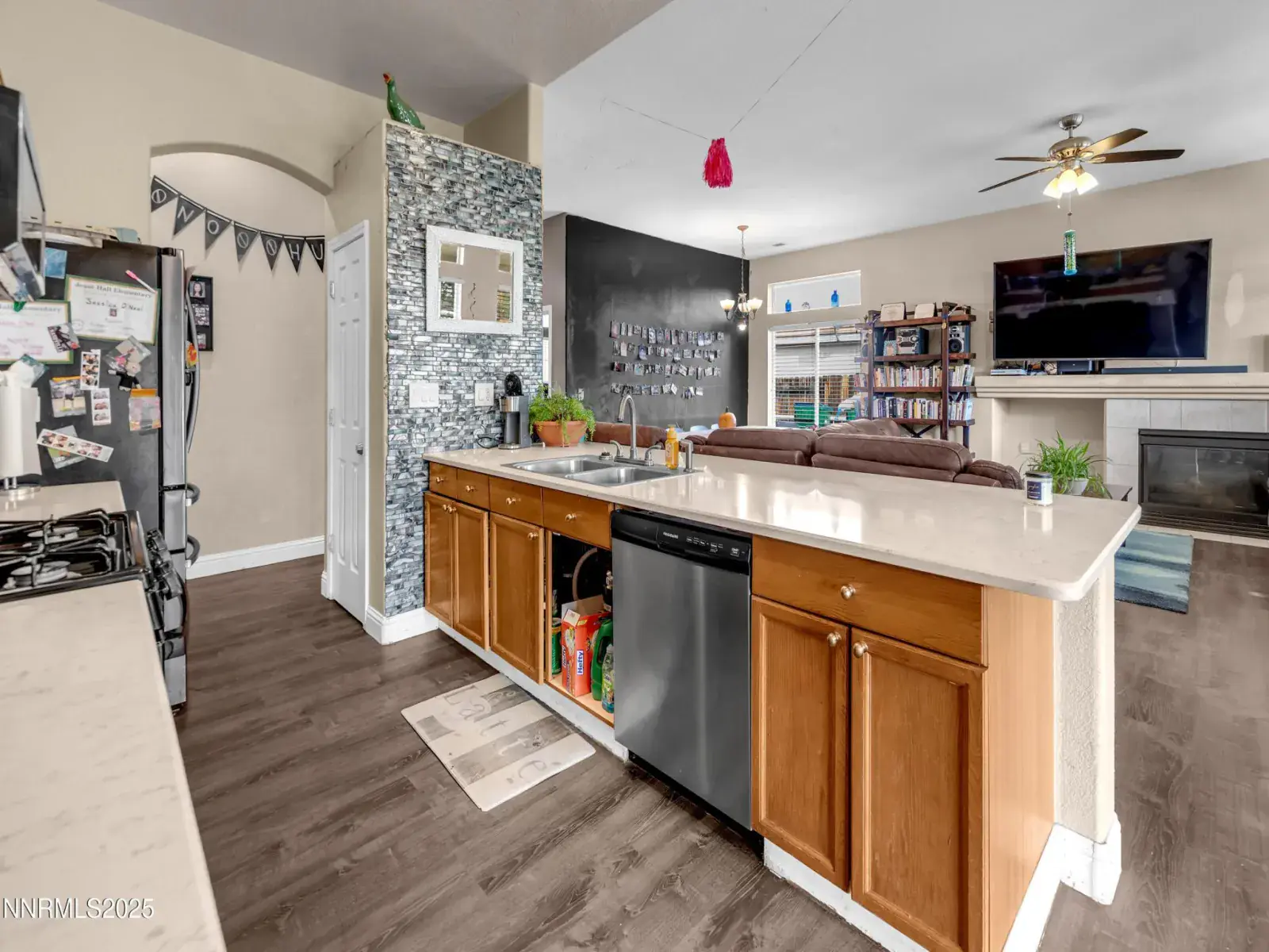 Single-story home in the heart of Spanish Springs featuring an open-concept floor plan with a spacious family and dining area just off the kitchen. The great room offers a cozy gas log fireplaceāperfect for relaxing or entertaining. The home includes 4 bedrooms, 2 baths, and durable vinyl plank flooring throughout. One bathroom is a blank slateāready for a future remodel and the perfect opportunity to design your dream space. The large, landscaped backyard includes a storage shed and chicken coop, ideal for gardening or outdoor hobbies. A 3-car garage with an additional storage room provides plenty of flexibility and can easily be converted back to a full third bay. This home offers great space, functionality, and room to make it your own in a desirable location close to parks, schools, and shopping.