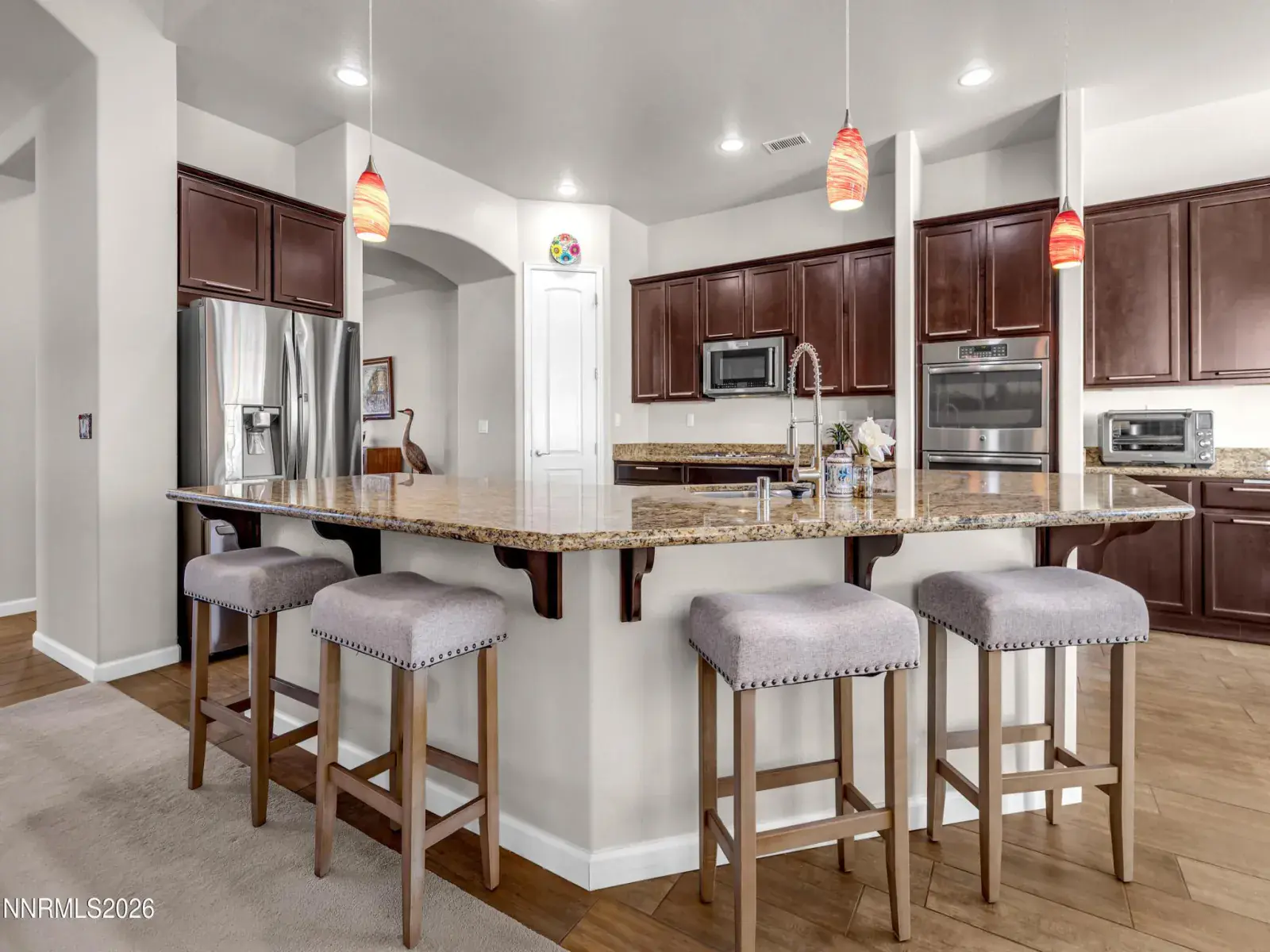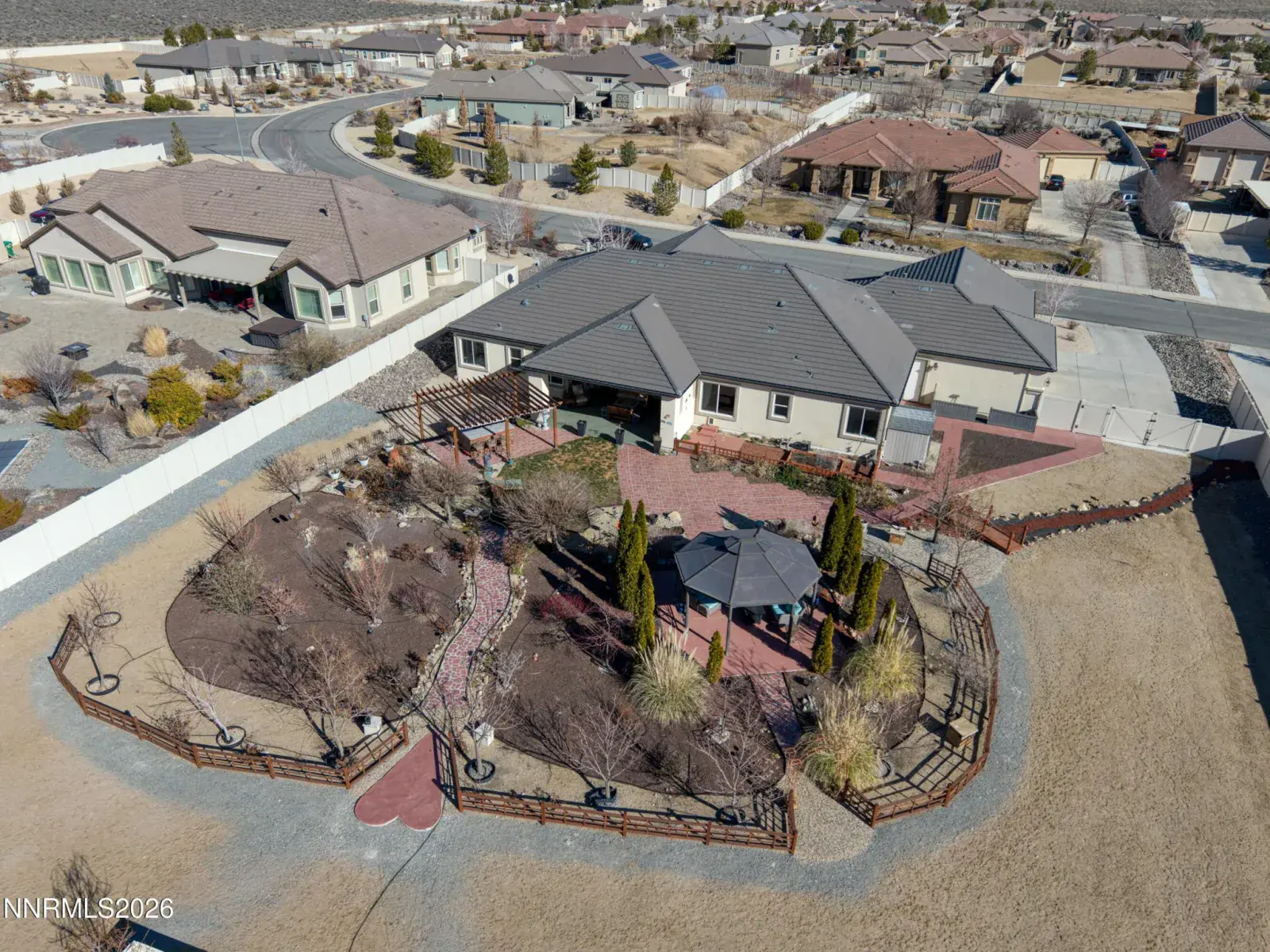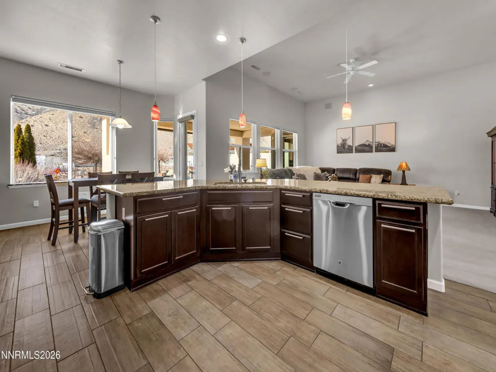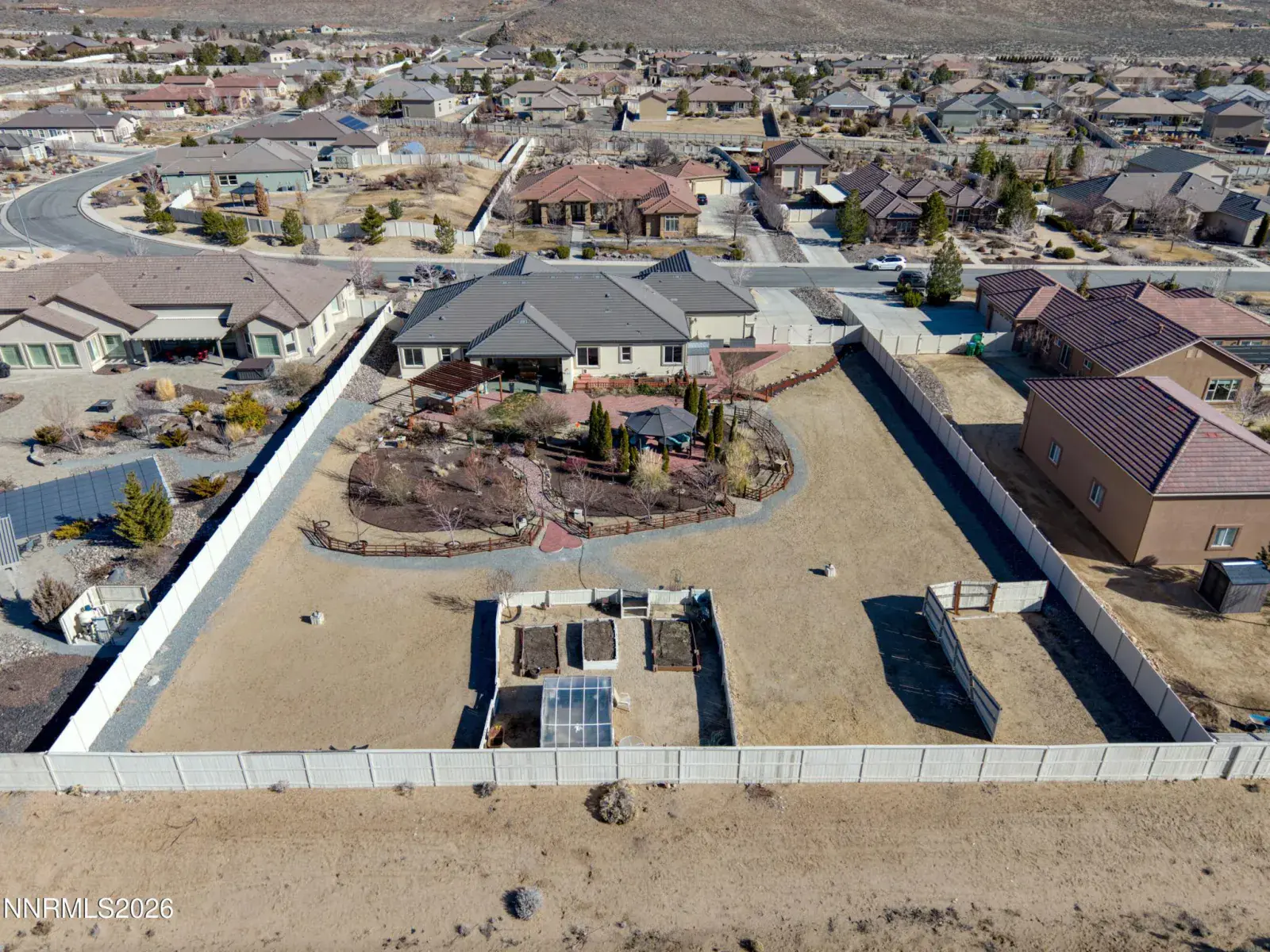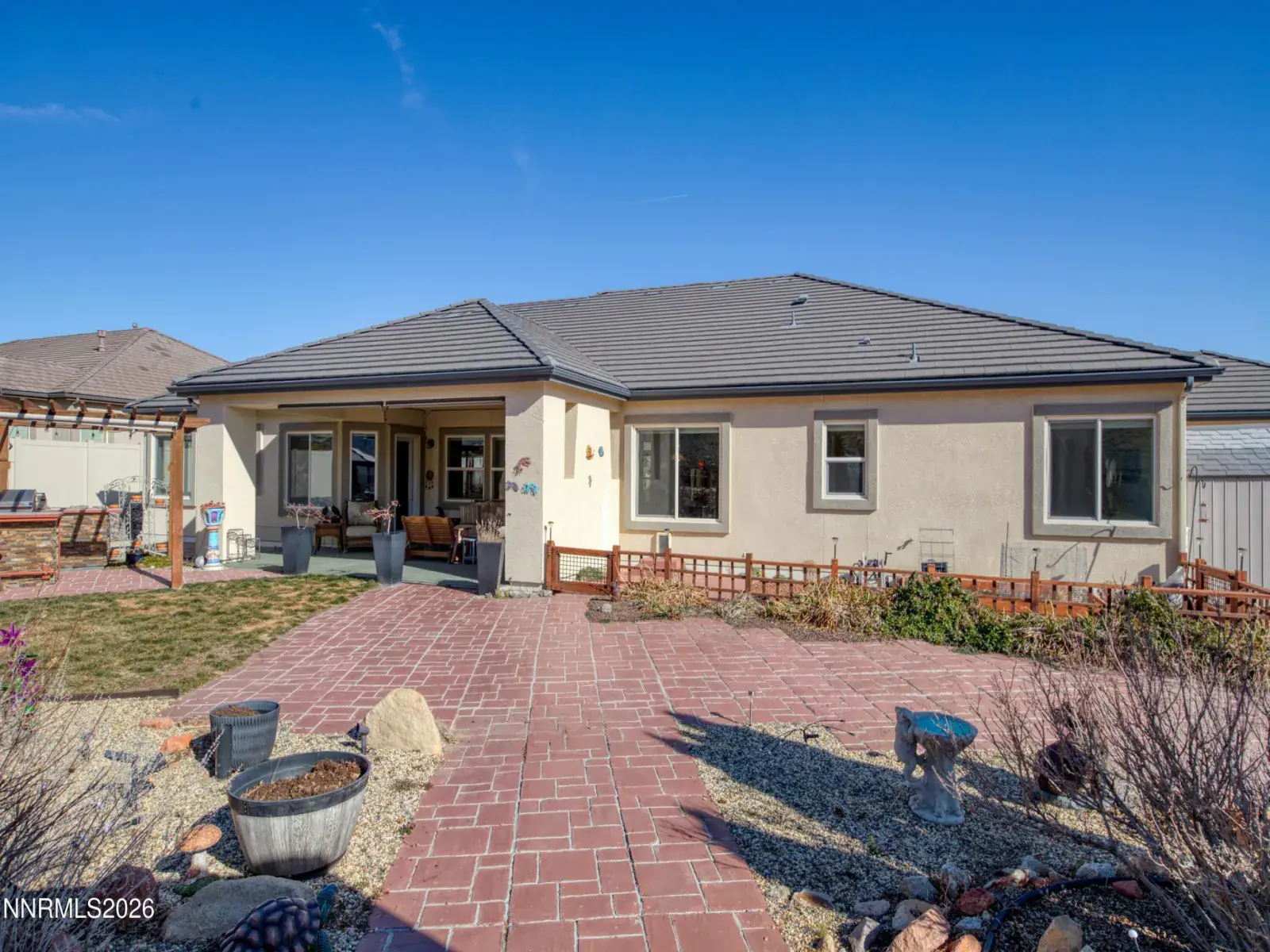 OPEN HOUSE Sat. 2/7 11am-1pm. Set against a dramatic mountain backdrop on nearly an acre in the luxury Spanish Springs community of Pebble Creek, this home offers a rare sense of privacy and calm. The backyard feels like a true retreatāpeaceful, expansive, and designed for year-round enjoyment of Northern Nevada’s high desert beauty. The single-level design, with no interior steps, is filled with natural light and thoughtfully laid out for both everyday living and entertaining. High ceilings enhance the already generous living spaces, creating a bright and open feel throughout. A formal dining room and sitting area flank the entry, offering a warm and welcoming first impression. At the heart of the home, the expansive kitchen is designed to gather. A wrap-around center island provides seating for six to eight, complemented by a casual dining nook for everyday meals. A corner pantry, coffee station, and double ovens add both function and ease for hosting or daily living. The primary suite is privately positioned on one end of the home, accompanied by an additional bedroom/office and full bathroom. On the opposite wing, three additional bedrooms, a full bath, built-in wall of desks, and a huge laundry room with sink and tons of cabinets. Outdoors, the backyard truly shines. A covered patio with a gas fireplace sets the stage for slow mornings and sunset evenings, while the outdoor barbecue bar and pergola are equally suited for large gatherings or intimate dinners. Side gates provide RV access for possible future RV garage. A greenhouse and garden beds sit at the back of the property for the avid gardener. Each spring, the property comes alive with mature trees, lush landscaping, and lawn, reinforcing the sense of a private sanctuaryājust minutes from shopping, dining, recreation, and schools.