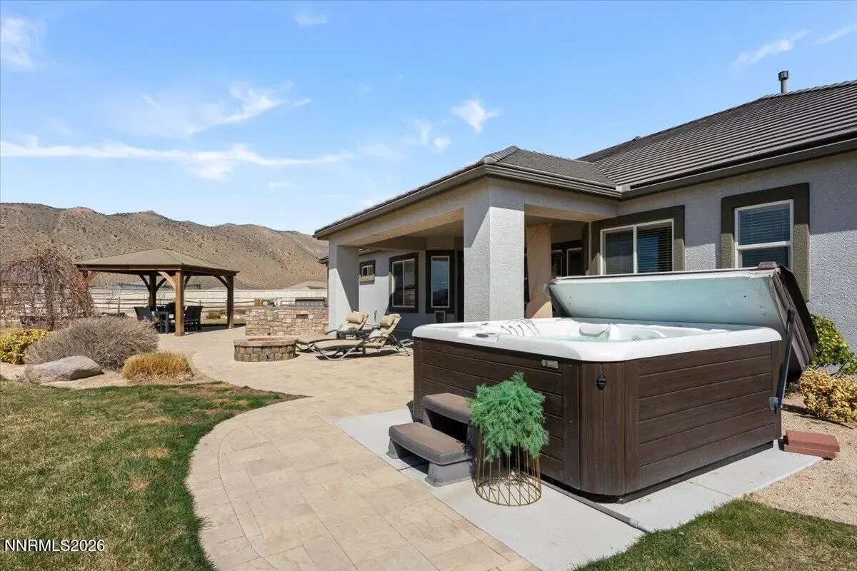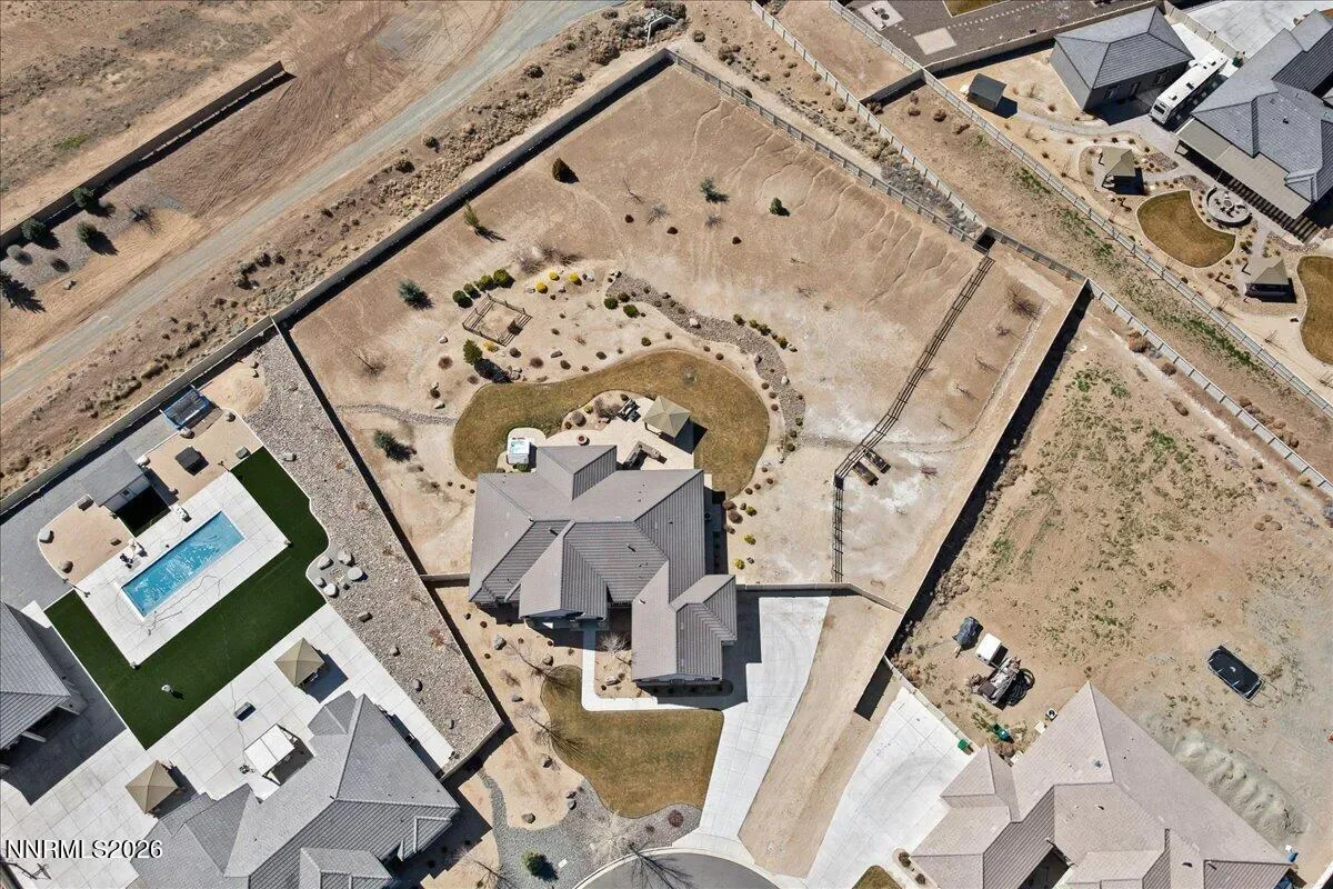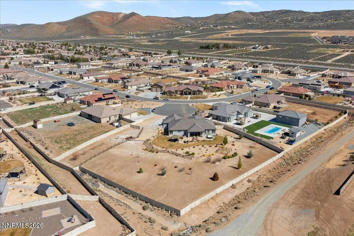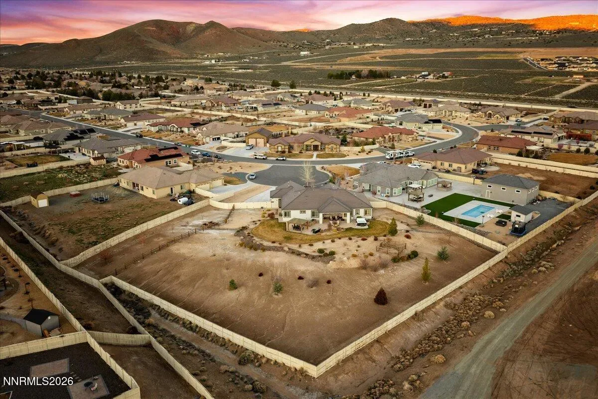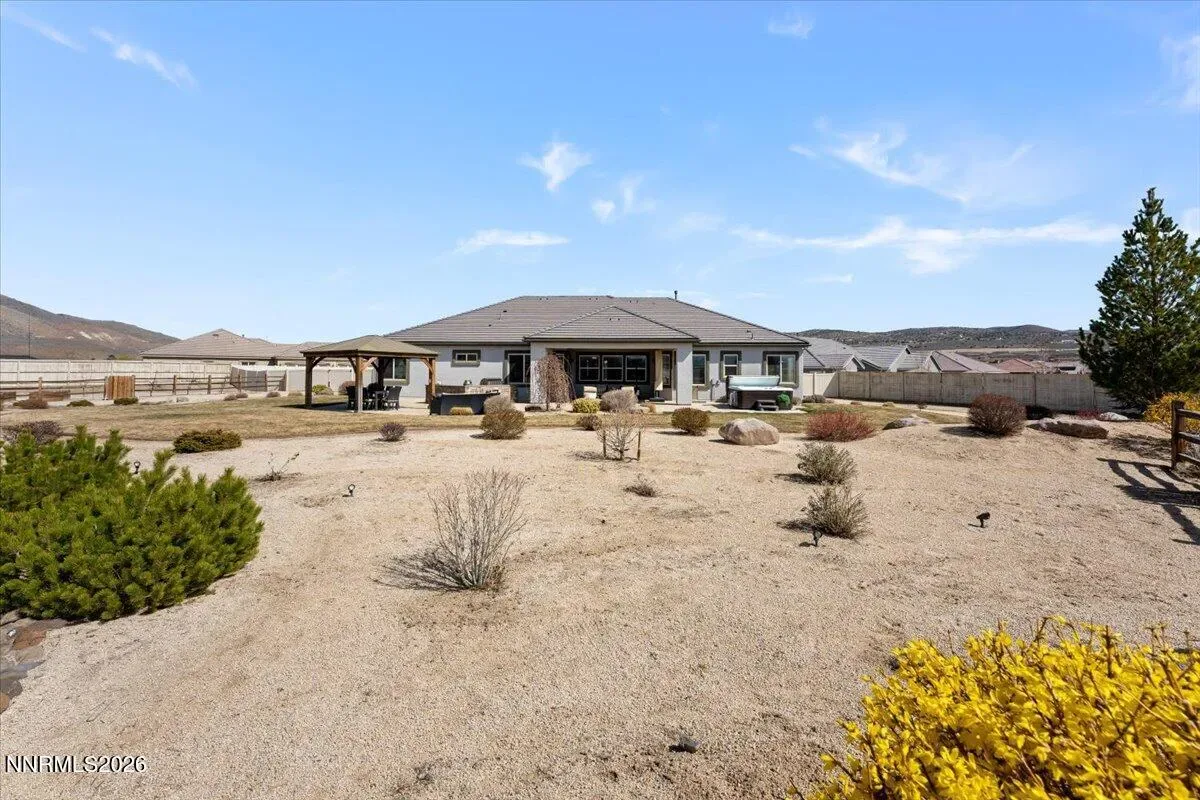 Located in the highly desirable Pebble Creek community and built in 2018, this exceptional single-story estate sits on 1.38 acres ā one of the largest lots in the neighborhood ā offering rare privacy, space, and sweeping mountain views. The home features 3,244 sq ft, 5 bedrooms, 3 bathrooms, and a 3-car garageādelivering modern luxury on a grand scale. Inside, the home is filled with natural light and features engineered hard-wood flooring, granite countertops, upgraded fixtures, and a spacious open-concept design ideal for both everyday living and upscale entertaining. The chef’s kitchen anchors the home with a large island, abundant workspace, and seamless connection to the great room and dining area. The separate living room currently serves as a game room, and the pool table with accessories is included. The private primary suite is a true retreat complete with a sitting area, custom walk-in closet and spa-like bath. The additional bedrooms are generously sized, offering flexibility for guests, office space, or multigenerational living. The insulated 3-car garage is equipped for enthusiasts and hobbyists alike, featuring a gear wall storage system, utility sink, 50,000 BTU heater, and EV charging receptacle. With 400-amp electrical service and a 100-amp stub-out, the property is primed for a future RV garage, workshop, or casita. Step outside to a resort-style backyard designed to capture the panoramic mountain setting. Enjoy an outdoor kitchen with built-in BBQ, granite counters, refrigerator, gas fire pit, hot tub, and powered gazebo, creating an ideal space for entertaining or relaxing under the Nevada sky. A rare combination of newer construction, privacy, upscale finishes, and usable acreage ā this is Northern Nevada living at its finest.