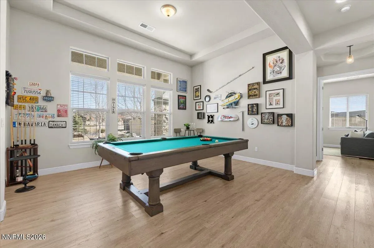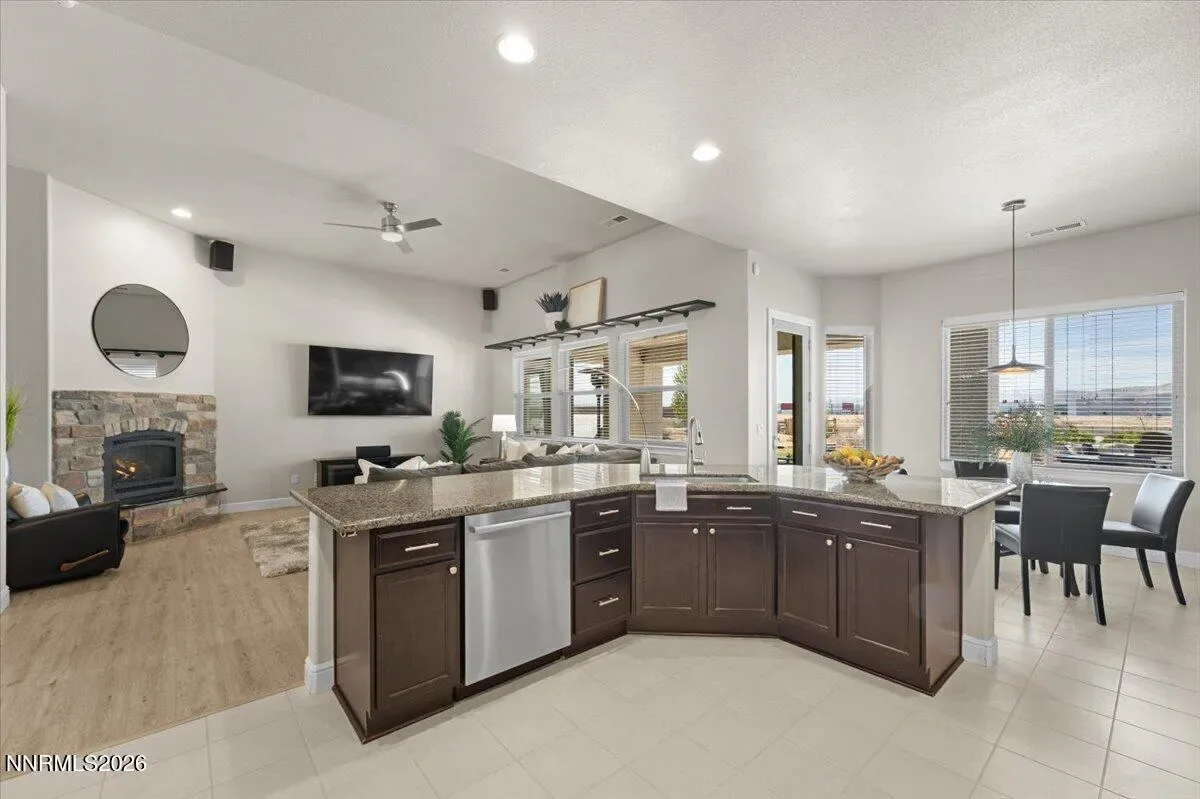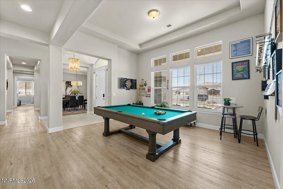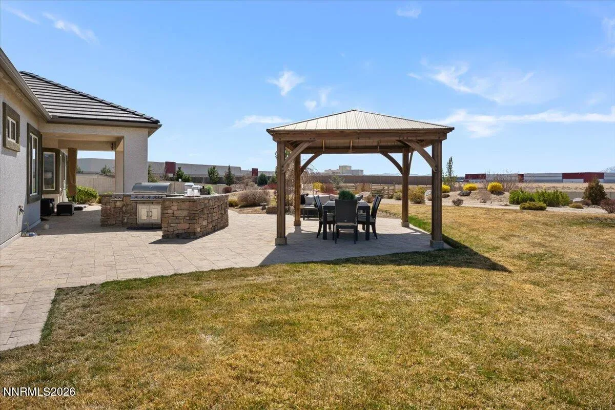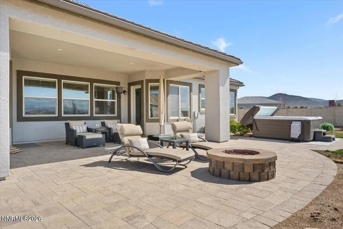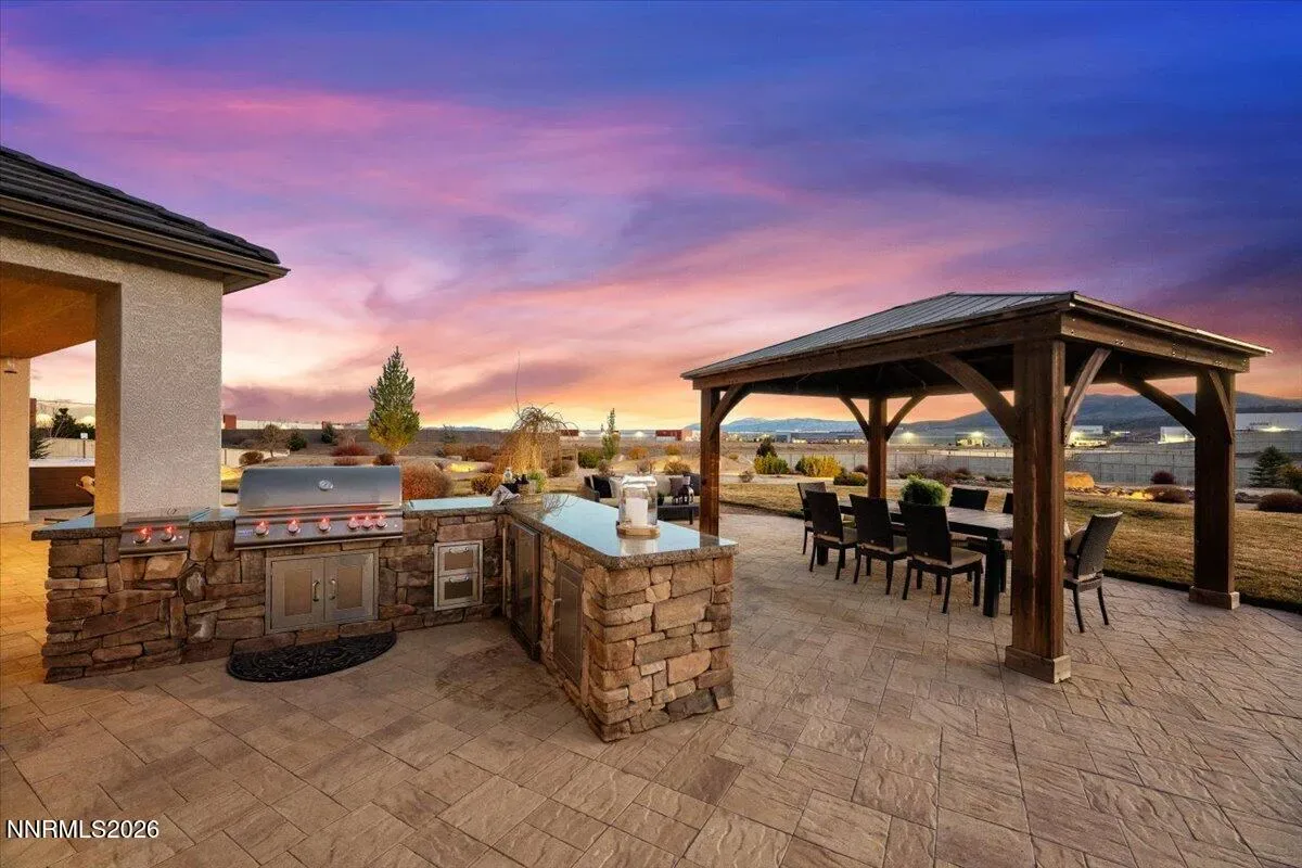 Located in the highly desirable Pebble Creek community and built in 2018, this exceptional single-story estate sits on 1.38 acres ā one of the largest lots in the neighborhood ā offering rare privacy, space, and sweeping mountain views. The home features 3,244 sq ft, 5 bedrooms, 3 bathrooms, and a 3-car garageādelivering modern luxury on a grand scale. Inside, the home is filled with natural light and features engineered hard-wood flooring, granite countertops, upgraded fixtures, and a spacious open-concept design ideal for both everyday living and upscale entertaining. The chef’s kitchen anchors the home with a large island, abundant workspace, and seamless connection to the great room and dining area. The separate living room currently serves as a game room, and the pool table with accessories is included. The private primary suite is a true retreat complete with a sitting area, custom walk-in closet and spa-like bath. The additional bedrooms are generously sized, offering flexibility for guests, office space, or multigenerational living. The insulated 3-car garage is equipped for enthusiasts and hobbyists alike, featuring a gear wall storage system, utility sink, 50,000 BTU heater, and EV charging receptacle. With 400-amp electrical service and a 100-amp stub-out, the property is primed for a future RV garage, workshop, or casita. Step outside to a resort-style backyard designed to capture the panoramic mountain setting. Enjoy an outdoor kitchen with built-in BBQ, granite counters, refrigerator, gas fire pit, hot tub, and powered gazebo, creating an ideal space for entertaining or relaxing under the Nevada sky. A rare combination of newer construction, privacy, upscale finishes, and usable acreage ā this is Northern Nevada living at its finest.