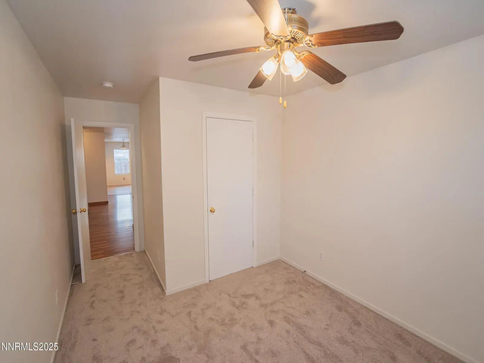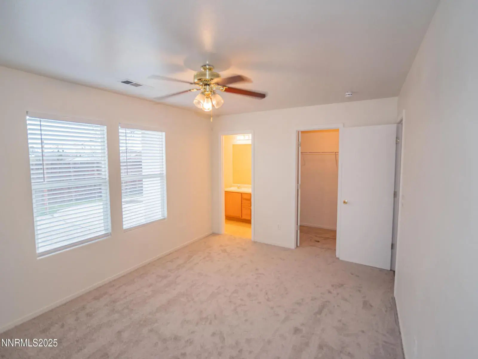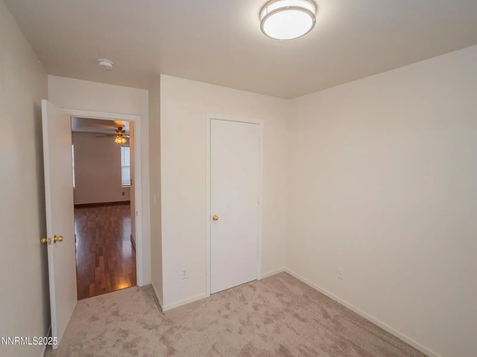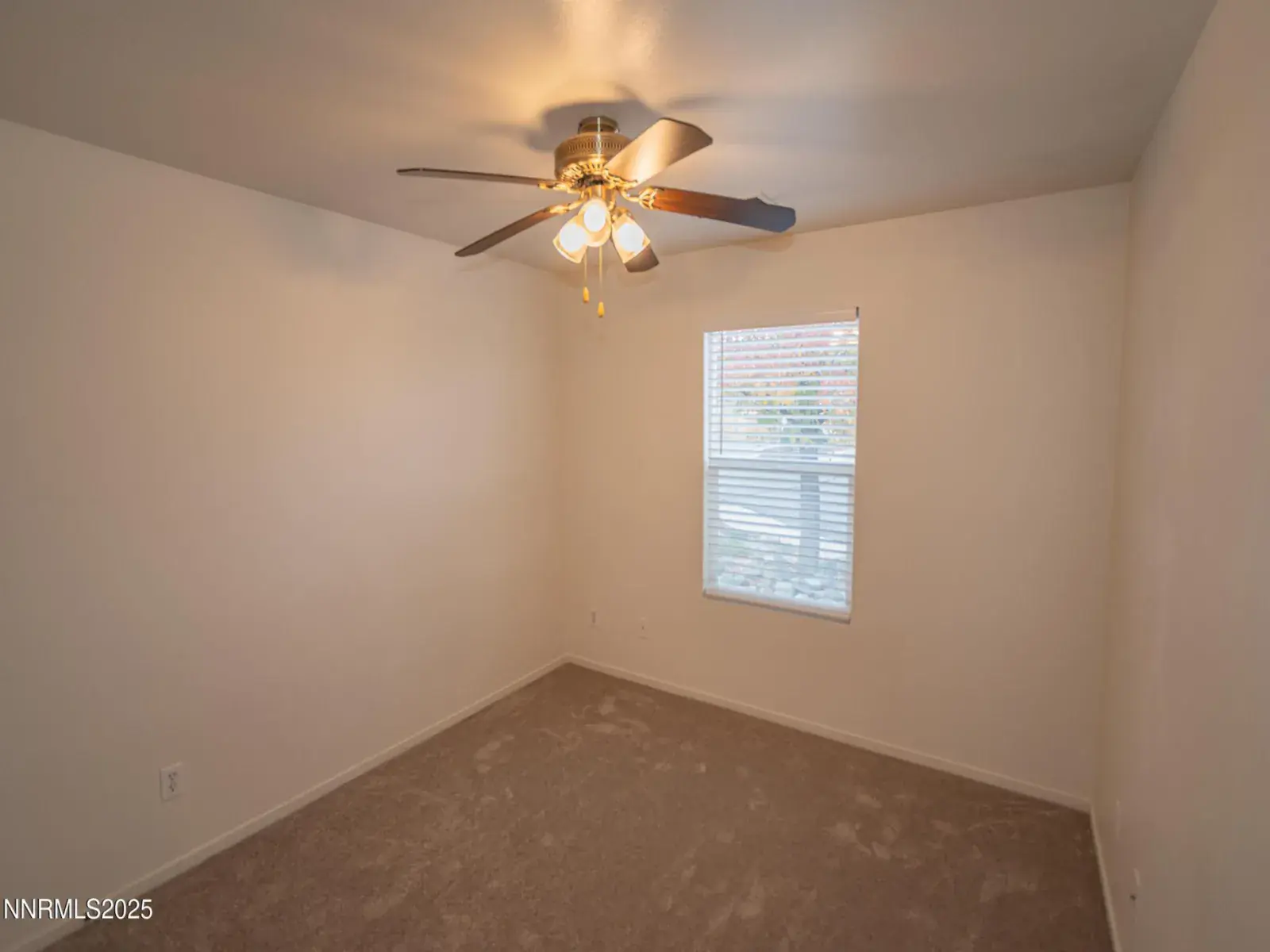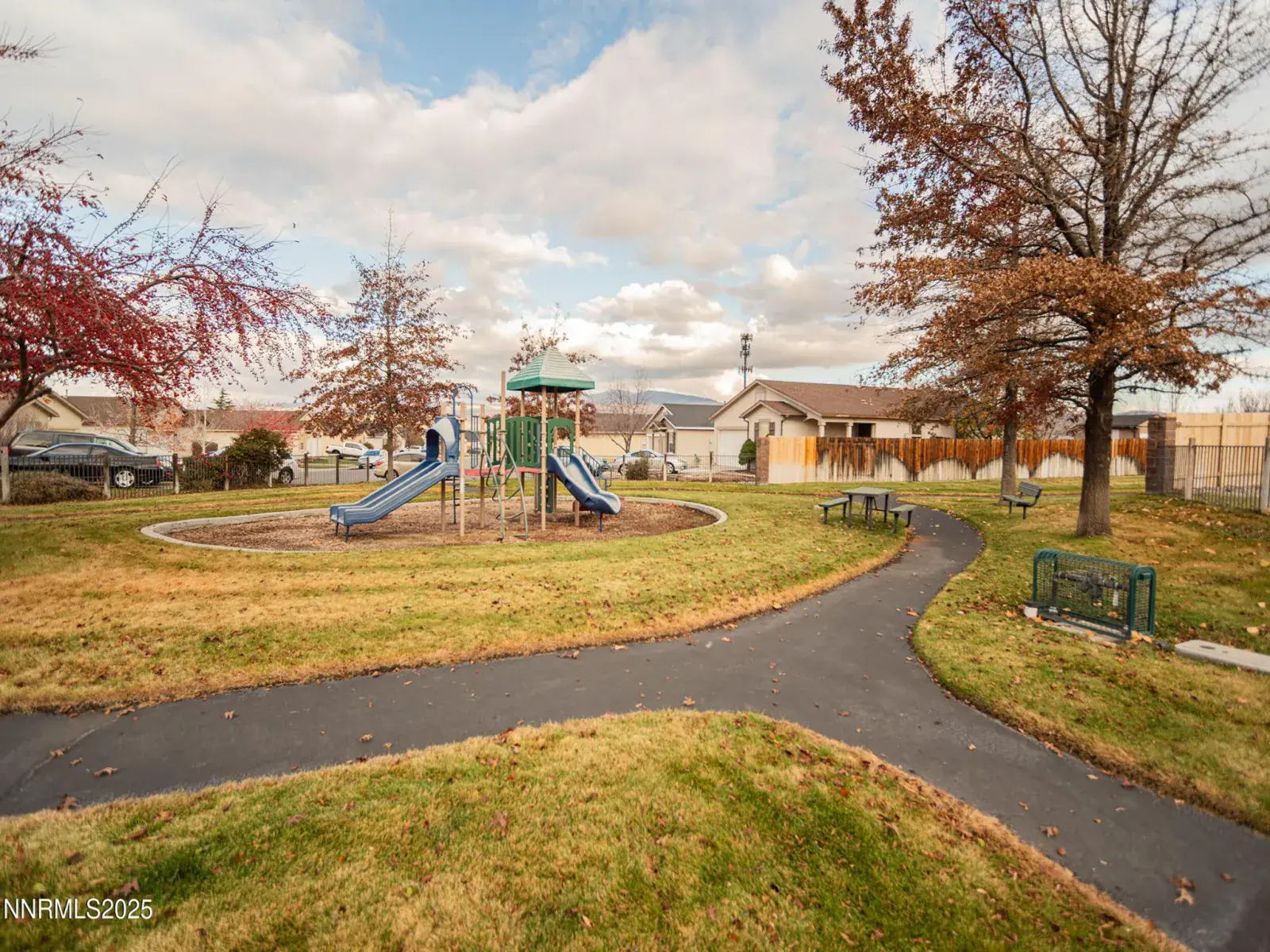 Great starter home near the end of a quiet cul-de-sac and one door away from a small, neighborhood park. Brand new carpet in the bedrooms with luxury vinyl in the kitchen and utility rooms and other vinyl flooring elsewhere. The living room and the master bedroom have ceiling fans. The master bedroom has a walk-in closet and double sinks in the bathroom. Fresh paint throughout with new washer and drier included. Stainless appliances in the kitchen, including the refrigerator, which also stays. There are two large patios in the back yard – one concrete and the other made from paver-bricks, as well as a separate dog run. The front yard has xeriscape, low-maintenance landscaping, with a little bit of grass in the backyard as well. The two-car garage has an electric opener, has been drywalled and taped, and has two areas of large, sturdy, built-in shelves. The HOA maintains the roads in the subdivision and one playground structure. The solar panels reduce your NV energy bills.