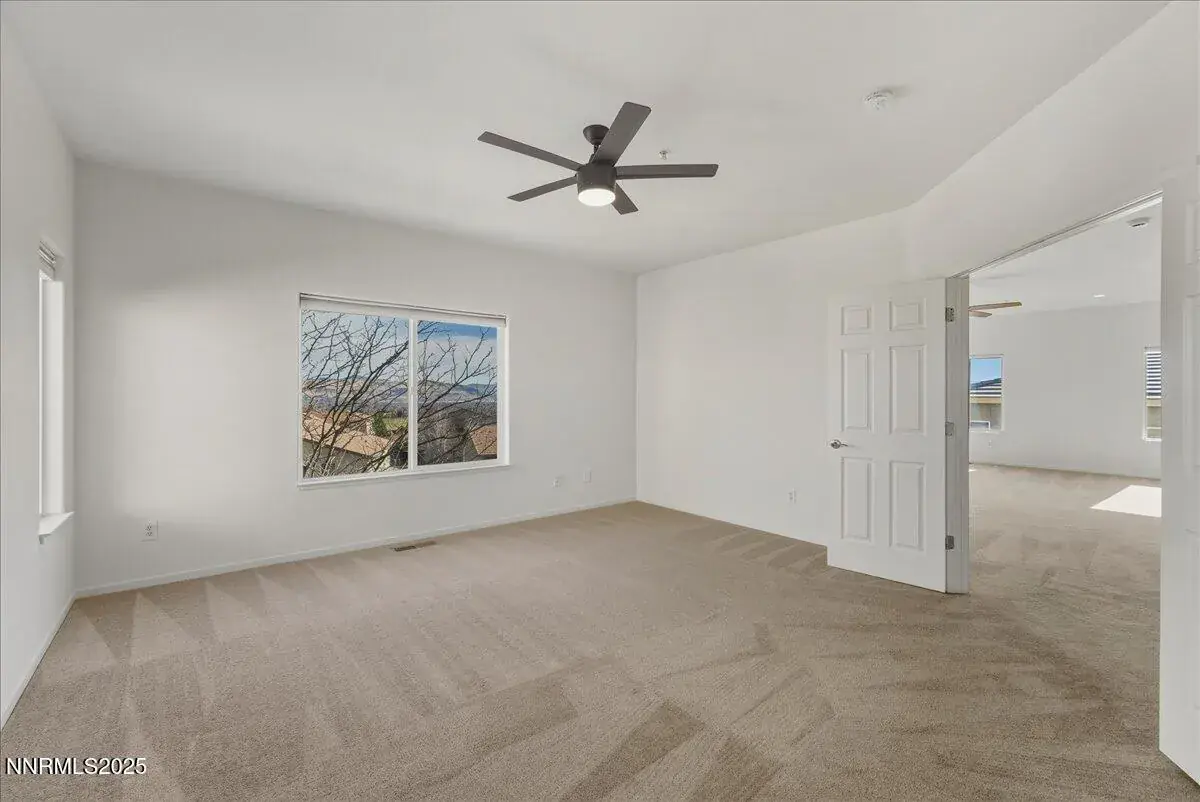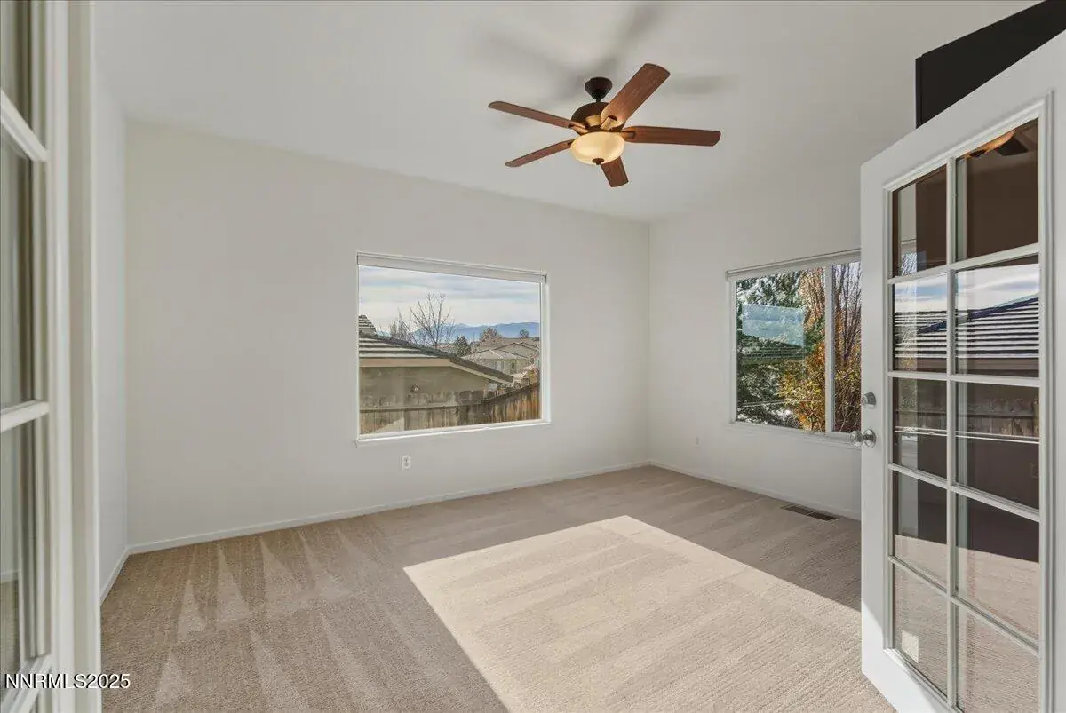 Absolutely exceptional home located in one of the most desirable golf-course pockets of Sparks, Wildcreek Estates! Nestled on a quiet cul de sac this beautifully maintained residence offers epic panoramic eastern facing views! With 2,308 sqft of living space and a fabulous up down floor plan this home is both functional and spectacular. From the moment you arrive, the tone is set with a welcoming faƧade and a perfect cul de sac location. This home offers a rare opportunity, only select homes in the neighborhood have access to these tremendous eastern facing valley views. Upon entering the front door to your right you will find french doors opening to a spacious bonus room that can easily be an office, hobby room, or extra bedroom. The kitchen is very open and features a new large single basin stainless steel sink with a pull down faucet, new appliances, tile countertops, pantry, and breakfast bar. The great room captures amazing natural light and flows to the dining area and living room. The living room has exceptional panoramic eastern facing views showcasing the eastern side of the valley. The living room also has an extremely convenient half bathroom. The primary suite is on the main level, the suite captures stellar views, and features dual vanities, a walk in tile shower and large walk in closet. Downstairs, you will find a large landing zone with easy access to the backyard. The space features two large bedrooms and a bathroom with dual vanity. This is truly a rare offering, time to start living your best life!