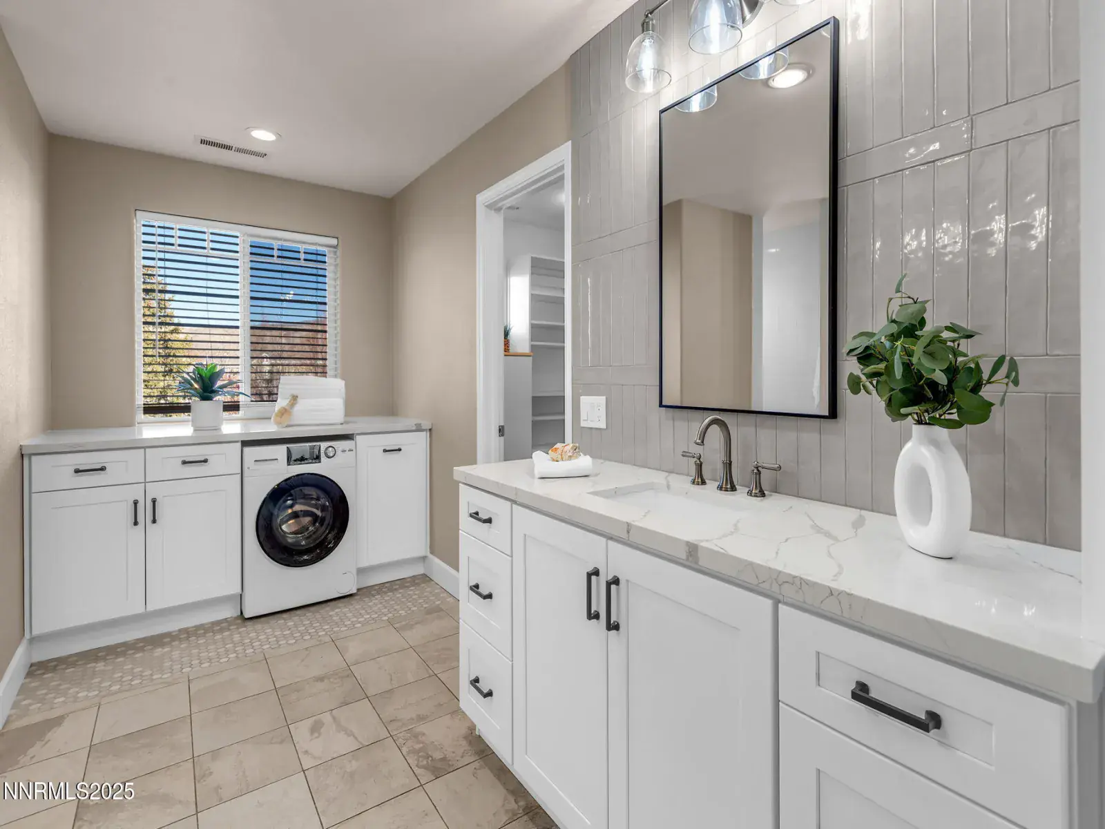Cabinets, Laundry Room, Shelves, Sink, Washer Hookup