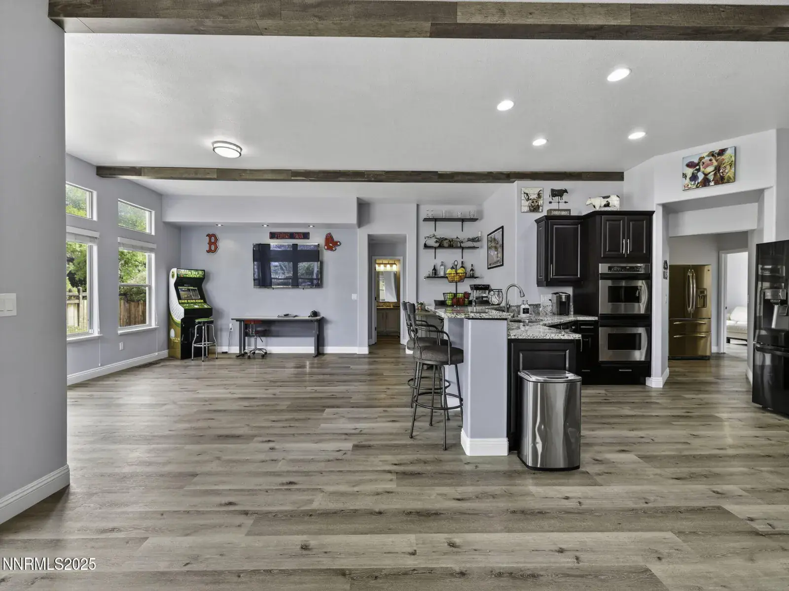 Custom single-level home on a quiet corner lot with mature landscaping and strong curb appeal. Inside, enjoy soaring ceilings with faux beams, luxury vinyl plank flooring, and a bright open great room built for everyday comfort and entertaining. The chef’s kitchen delivers granite counters, gas range, four ovens, walk-in pantry, and an oversized breakfast bar that flows into the main living area. A split-bedroom layout adds privacy, and the flex/bonus rooms are ideal for a home office, guest space, or media room. Step outside to a backyard designed for Nevada living! Partially covered paver patio, a sunken paver sitting area, and a gas-plumbed firepit for easy, year-round gatherings, plus a putting green and raised garden bed. More highlights include a dedicated laundry with storage, custom paint throughout, and a 3-car garage. Minutes to neighborhood parks, trails, and the Red Hawk clubhouse/dining. Move-in ready.
