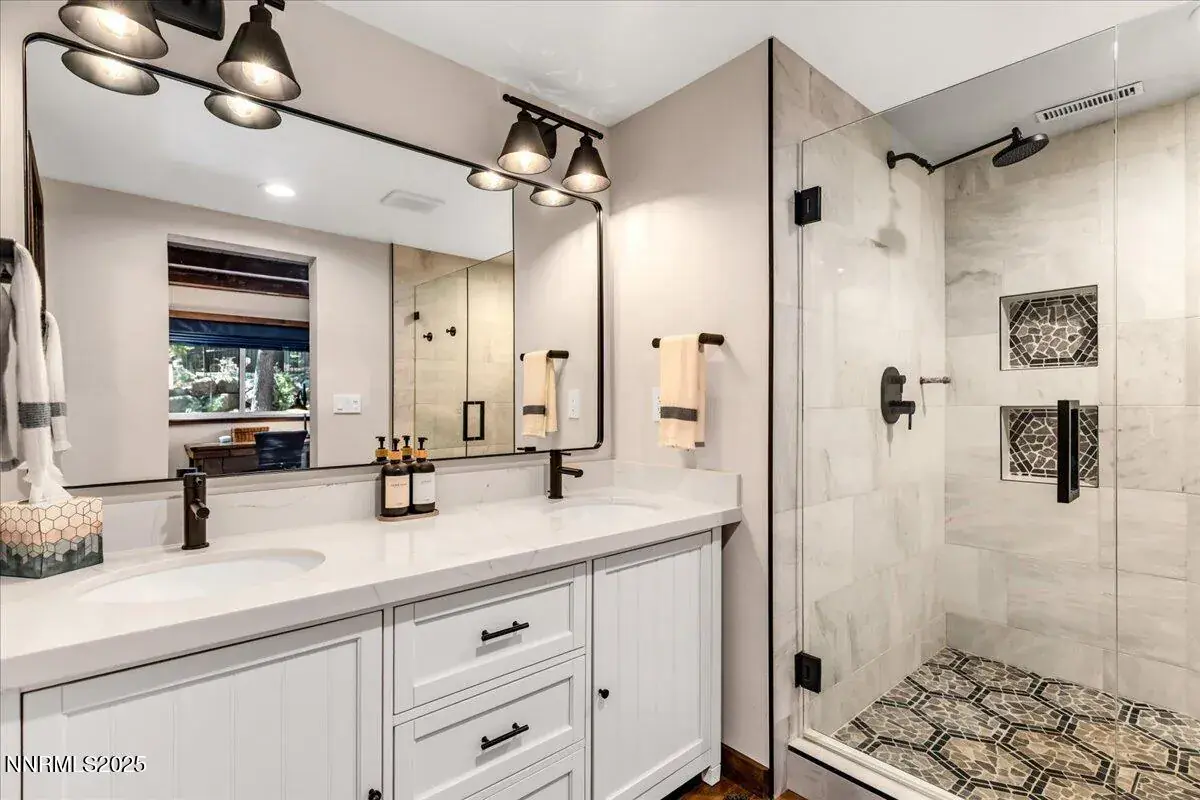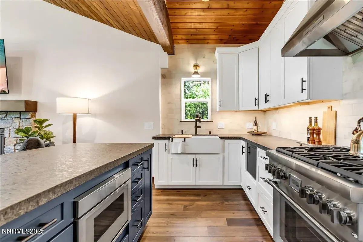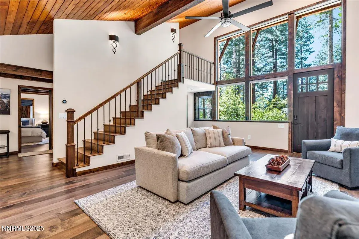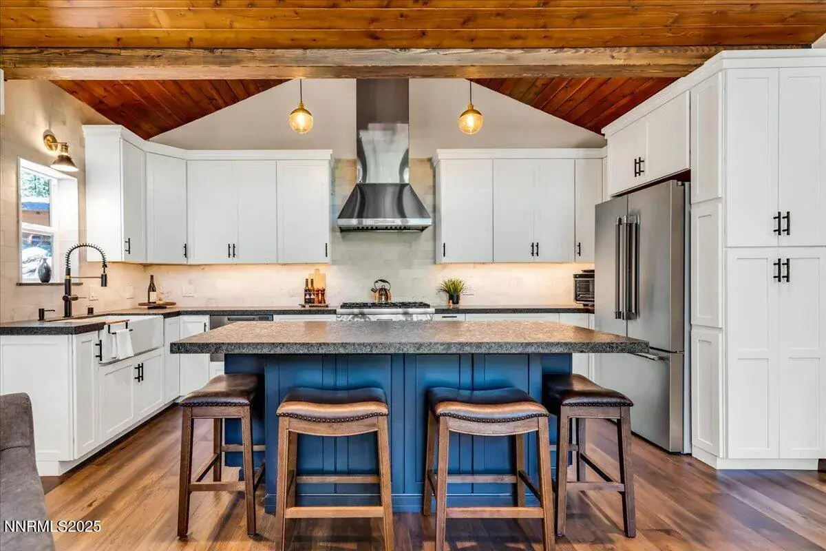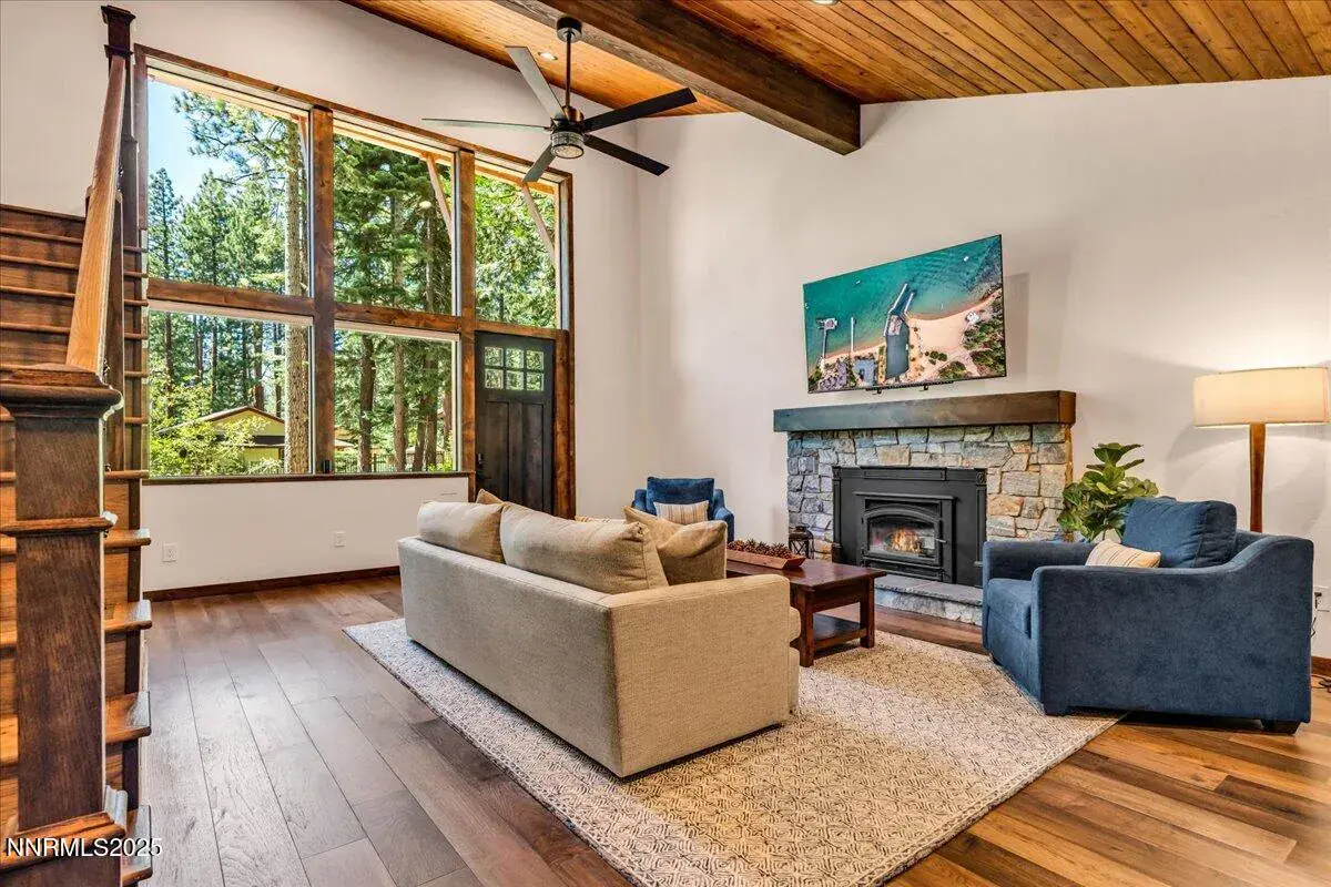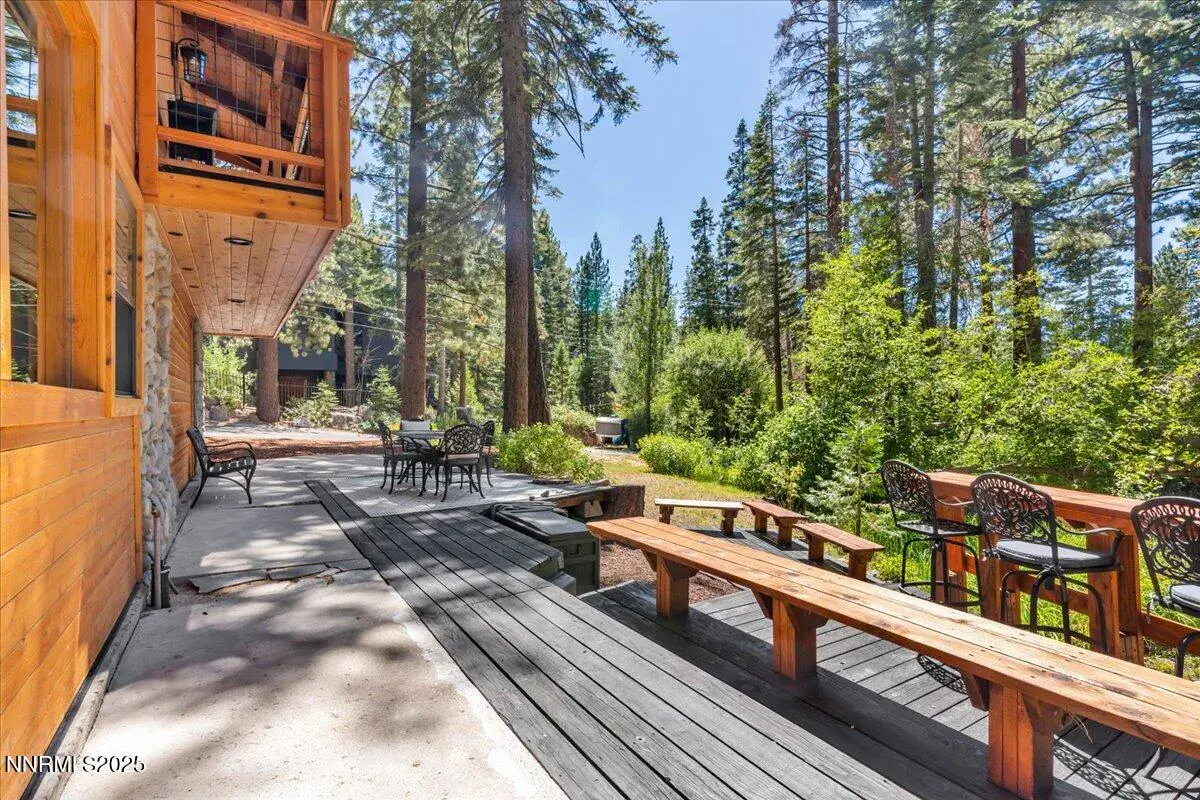 Experience the essence of Tahoe living at 370 Summit Drive, a truly unique and exquisitely maintained mountain modern retreat nestled in one of Lake Tahoe’s most desirable communities, Middle Kingsbury. Step onto the deck and be greeted by the tranquil sounds of Burke Creek flowing just beyond your front door. This thoughtfully renovated , fully furnished, move-in-ready home offers a serene setting that’s hard to find, especially on a generous 0.54-acre lot. This peaceful creekside ambiance creates the perfect backdrop for relaxation. Renovations were completed in 2025. Wrapped in warm cedar and accented with natural river rock, this home makes a striking architectural statement. Inside, discover 2 bedrooms, 2.5 bathrooms, and a seamless blend of modern luxury and rustic elegance. Soaring vaulted cedar plank ceilings and an expansive glass wall flood the open-concept living space with natural light, bringing the outdoors in, while central air conditioning ensures year-round comfort. A granite stone wood burning fireplace serves as the centerpiece of the living area, seamlessly complementing the gourmet kitchen featuring leathered granite countertops, soft close cabinetry, a hand-selected marble backsplash, a large island with seating for four, top of the line appliances, and high-end finishes throughout. In addition, engineered hickory hardwood floors were carefully selected for their exceptional durability and timeless quality. The primary suite offers a walk-in closet and a beautifully appointed ensuite bath, featuring dual sinks and a spacious shower with a natural stone floor that has been artfully designed bringing the beauty of the outdoors inside. Upstairs, the guest suite provides comfort and privacy with its own ensuite bathroom and a sliding glass door that opens to a private deck overlooking Burke Creek, an ideal retreat for visitors or extended stays. This home boasts a brand-new furnace and air conditioning system, a tankless water heater, a new roof, and completely updated electrical wiring and plumbing. Modern smart-home features include five Ring security cameras and a Nest thermostat for comfort and peace of mind. Tucked away on a peaceful cul-de-sac, the property offers generous parking and effortless access to the natural beauty that surrounds it with miles of hiking and biking trails just steps away, including the popular Stinger Trail. A storage shed located at the far north corner of the property offers convenient space for yard tools, outdoor equipment, and additional storage needs. Beyond the property’s boundaries, you’ll have access to a wealth of year-round recreational activities. Explore nearby world-class ski resorts, or enjoy thrilling water sports on the pristine waters of Lake Tahoe. It’s the perfect retreat after a day of outdoor adventures. Whether you’re looking for a private mountain escape or a lucrative rental investment, this creekside luxury retreat is the opportunity you’ve been waiting for. Schedule your private showing today and experience Tahoe living at its finest.