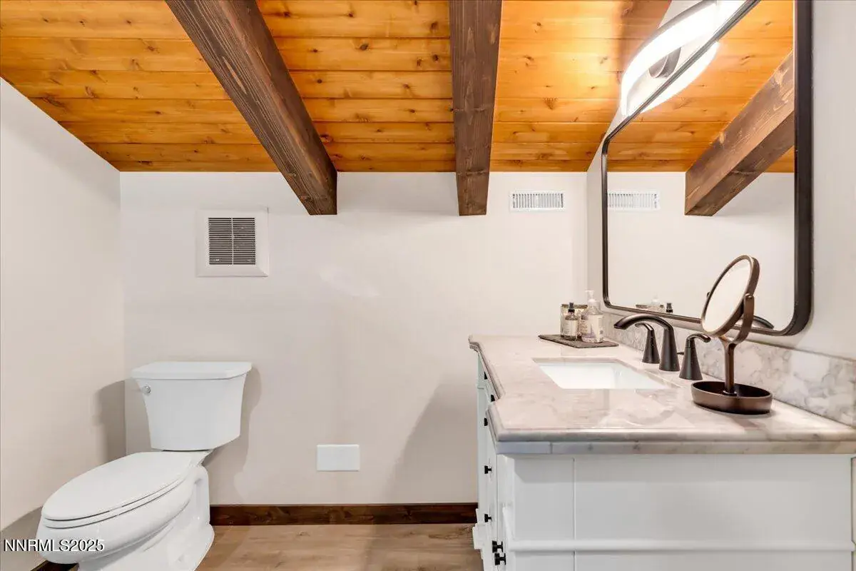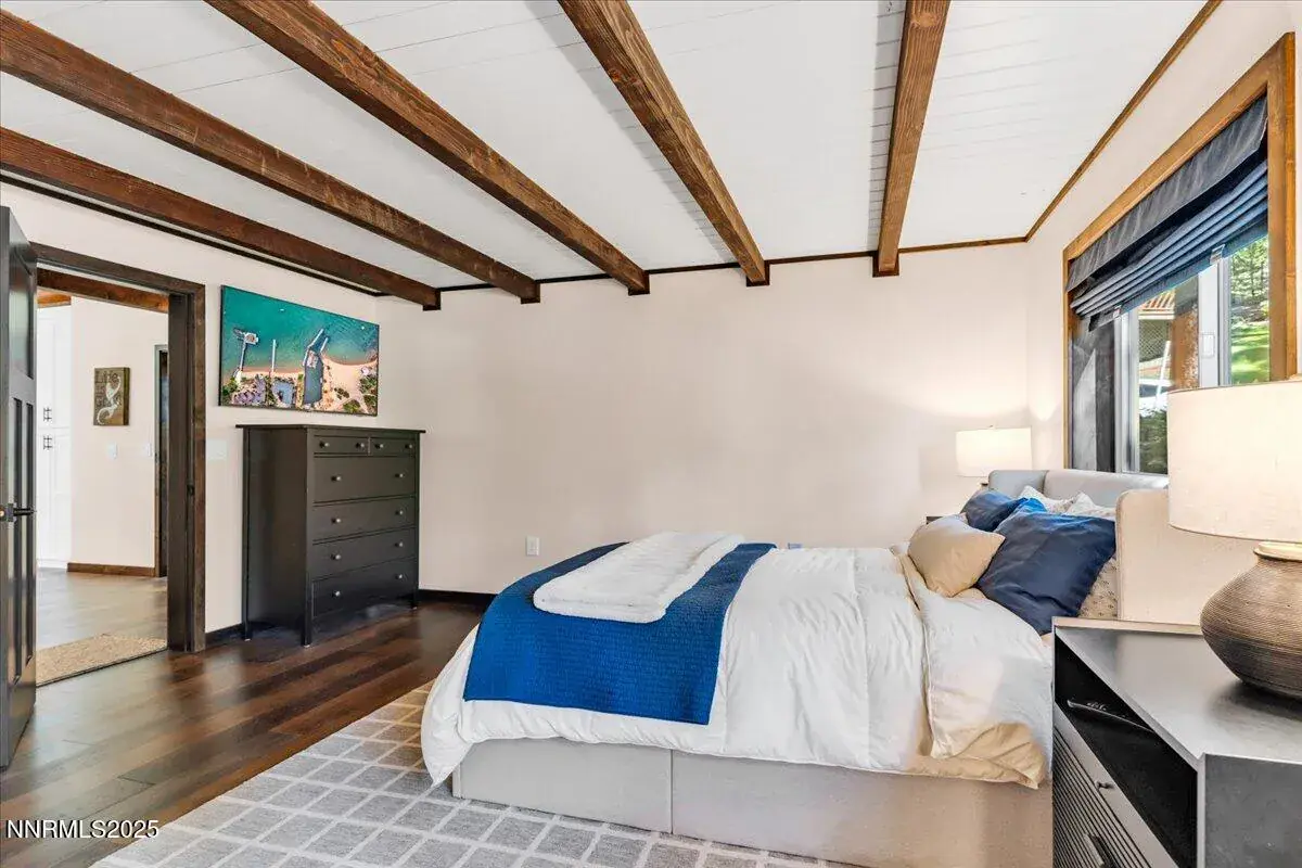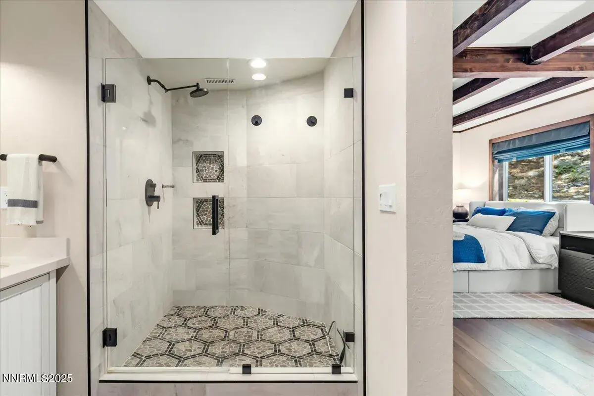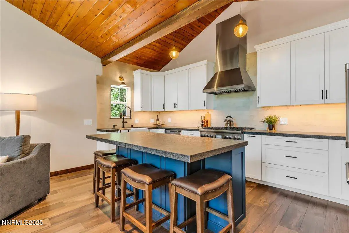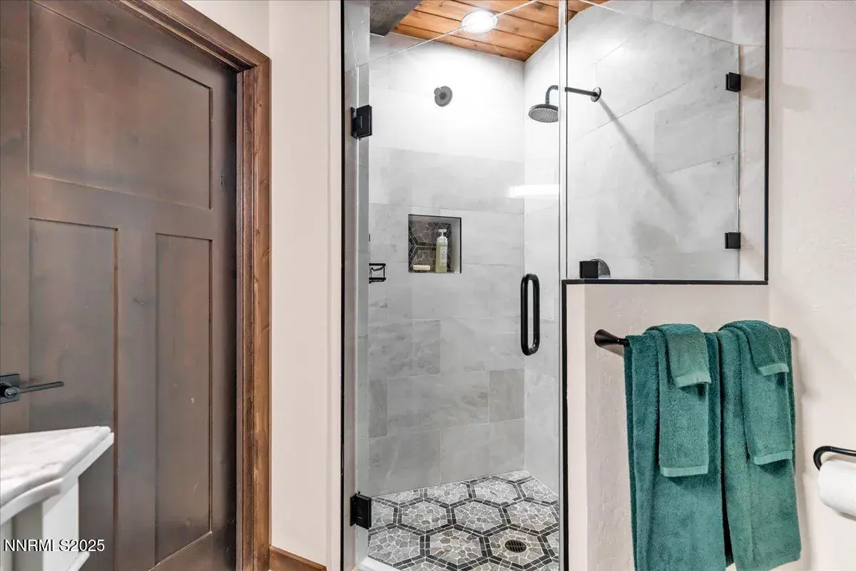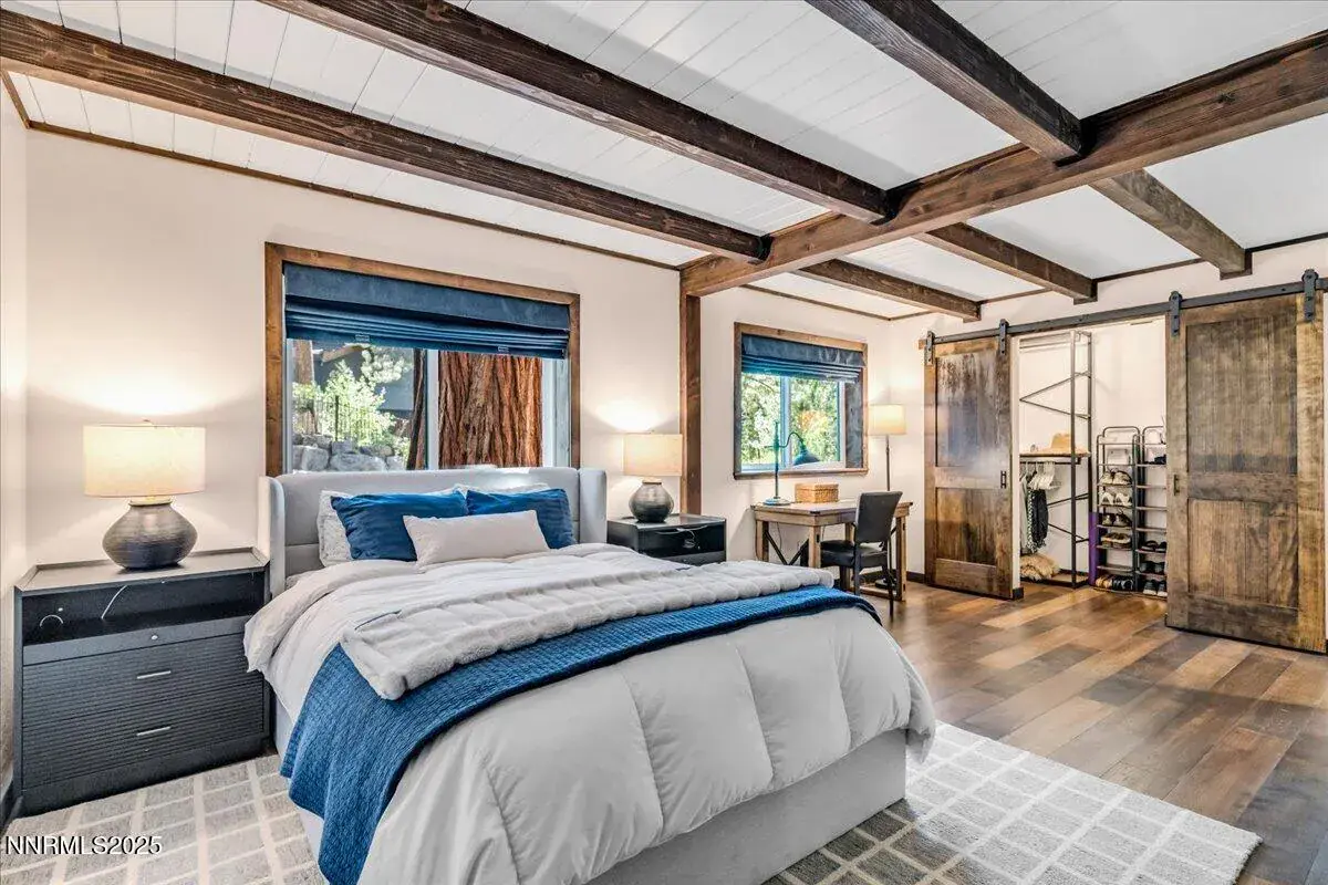 Experience the essence of Tahoe living at 370 Summit Drive, a truly unique and exquisitely maintained mountain modern retreat nestled in one of Lake Tahoe’s most desirable communities, Middle Kingsbury. Step onto the deck and be greeted by the tranquil sounds of Burke Creek flowing just beyond your front door. This thoughtfully renovated , fully furnished, move-in-ready home offers a serene setting that’s hard to find, especially on a generous 0.54-acre lot. This peaceful creekside ambiance creates the perfect backdrop for relaxation. Renovations were completed in 2025. Wrapped in warm cedar and accented with natural river rock, this home makes a striking architectural statement. Inside, discover 2 bedrooms, 2.5 bathrooms, and a seamless blend of modern luxury and rustic elegance. Soaring vaulted cedar plank ceilings and an expansive glass wall flood the open-concept living space with natural light, bringing the outdoors in, while central air conditioning ensures year-round comfort. A granite stone wood burning fireplace serves as the centerpiece of the living area, seamlessly complementing the gourmet kitchen featuring leathered granite countertops, soft close cabinetry, a hand-selected marble backsplash, a large island with seating for four, top of the line appliances, and high-end finishes throughout. In addition, engineered hickory hardwood floors were carefully selected for their exceptional durability and timeless quality. The primary suite offers a walk-in closet and a beautifully appointed ensuite bath, featuring dual sinks and a spacious shower with a natural stone floor that has been artfully designed bringing the beauty of the outdoors inside. Upstairs, the guest suite provides comfort and privacy with its own ensuite bathroom and a sliding glass door that opens to a private deck overlooking Burke Creek, an ideal retreat for visitors or extended stays. This home boasts a brand-new furnace and air conditioning system, a tankless water heater, a new roof, and completely updated electrical wiring and plumbing. Modern smart-home features include five Ring security cameras and a Nest thermostat for comfort and peace of mind. Tucked away on a peaceful cul-de-sac, the property offers generous parking and effortless access to the natural beauty that surrounds it with miles of hiking and biking trails just steps away, including the popular Stinger Trail. A storage shed located at the far north corner of the property offers convenient space for yard tools, outdoor equipment, and additional storage needs. Beyond the property’s boundaries, you’ll have access to a wealth of year-round recreational activities. Explore nearby world-class ski resorts, or enjoy thrilling water sports on the pristine waters of Lake Tahoe. It’s the perfect retreat after a day of outdoor adventures. Whether you’re looking for a private mountain escape or a lucrative rental investment, this creekside luxury retreat is the opportunity you’ve been waiting for. Schedule your private showing today and experience Tahoe living at its finest.