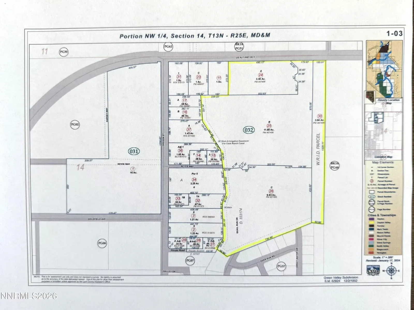 Investment Opportunity!!! 28.05 acres of raw land ready to develop. 4 parcels included in this sale with zoning of C2, R1, and Multi (Parcels: 001-032-24, 25,26,30). These parcels together have 4 entrance points; Hwy 95A East, Reyes Way, Quail Run Drive, and Sweetwater Drive. Walkable to schools, shopping, Main Street, etc.